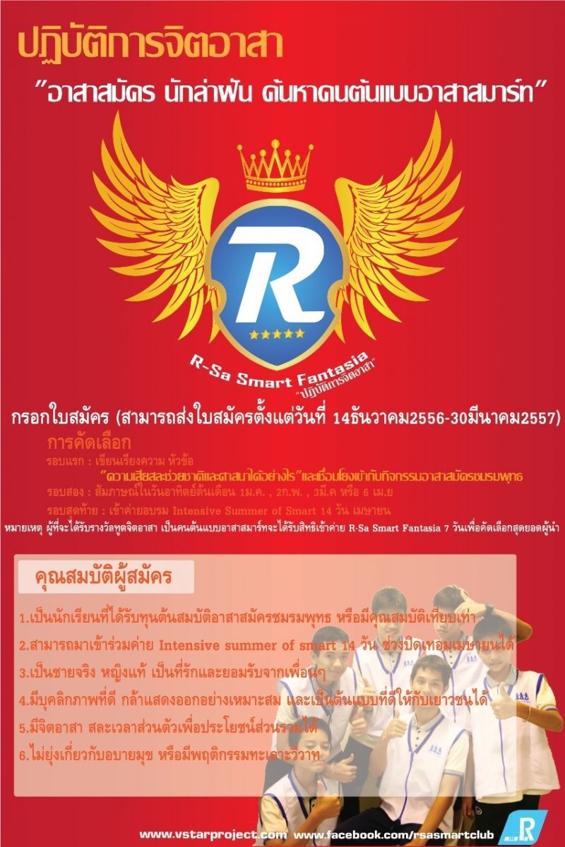 | หัวข้อ | อาสาสมัคร นักล่าฝัน ค้นหาคนต้นแบบอาสาสมาร์ท R-Sa Smart Fantasia เวทีสู่ทูตจิตอาสา เร็วๆนี้ |
