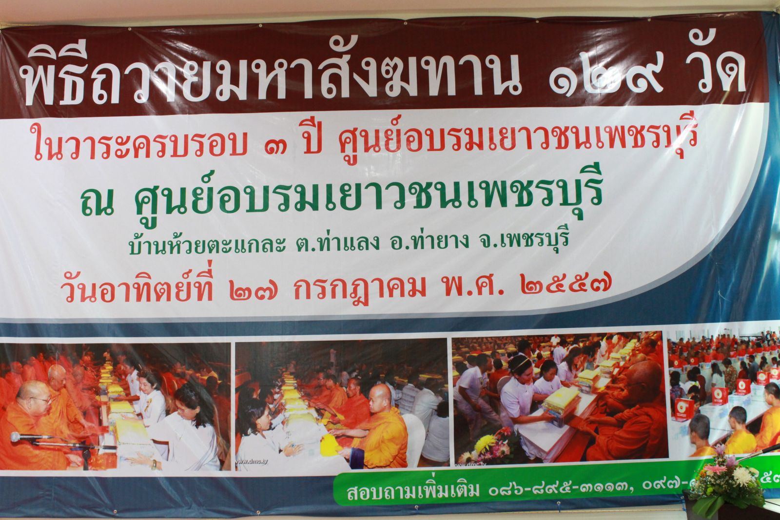 ชมรมพุทธศาสตร์สากลนำโดยผู้ประสานงานจังหวัดโซน 7 ( จ.เพชรบุรีและ จ.ประจวบคีรีขันธ์ ) ลงพื้นที่ร่วมกิจกรรมมุทิตาพระครูใบฎีกาวรวิทย์ ถิรปญฺโญ, ถวายสังฆทาน 129 วัด และฉลองครบรอบ 3 ปีของศูนย์อบรมเยาวชนเพชรบุรี ต.ท่าแลง อ.ท่ายาง จ.เพชรบุรี ในวันอาทิตย์ที่ 28 กรกฎาคม 2557 ที่ผ่านมา