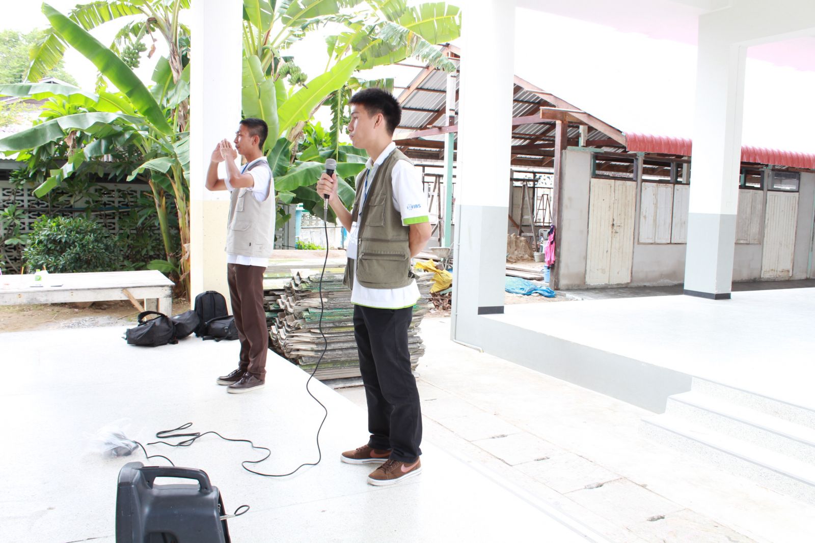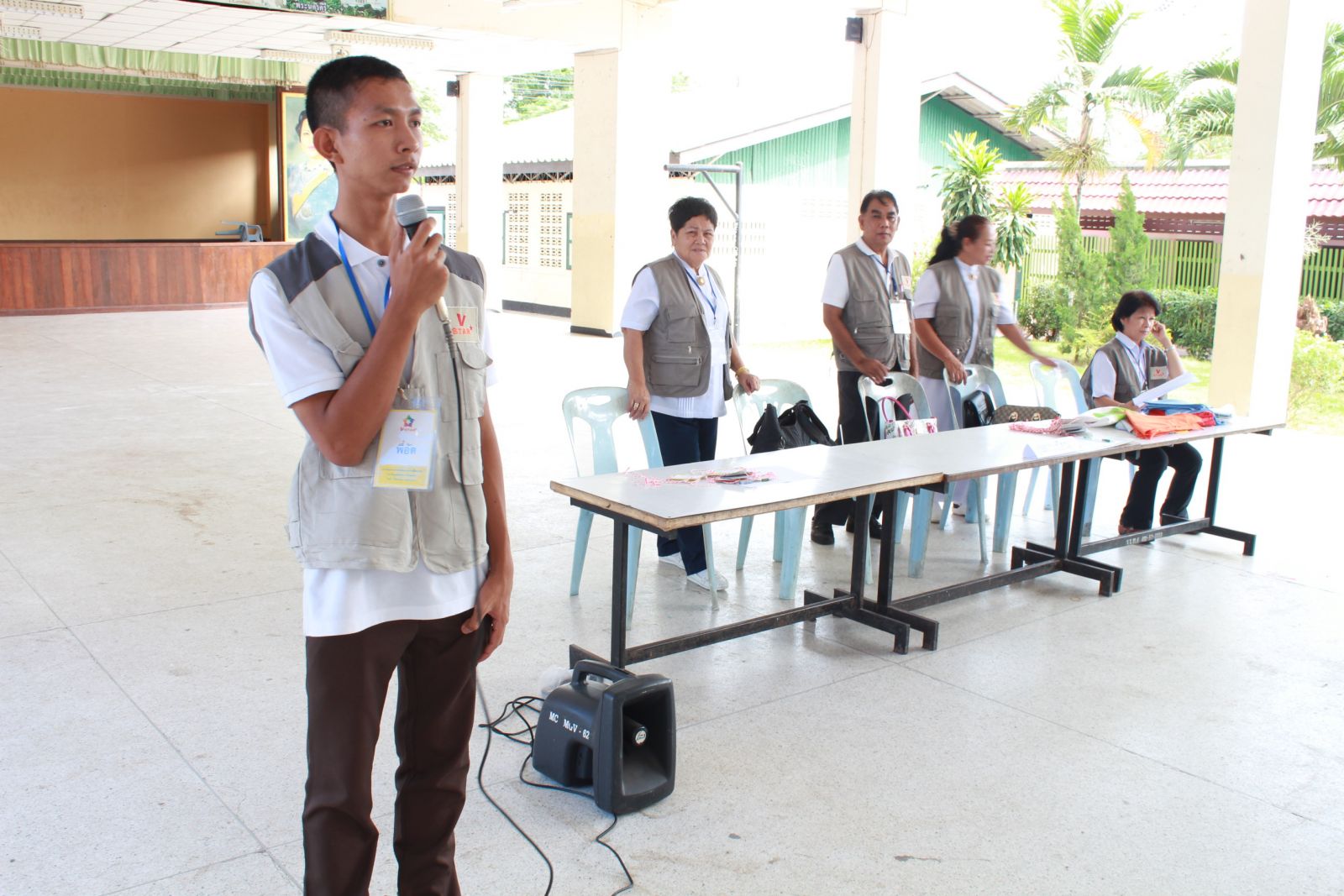 คุณครูมงกุฏ ตรีเงินกุล ครูประสานงานโครงการวีสตาร์ เป็นพิธีกรงานตักบาตร