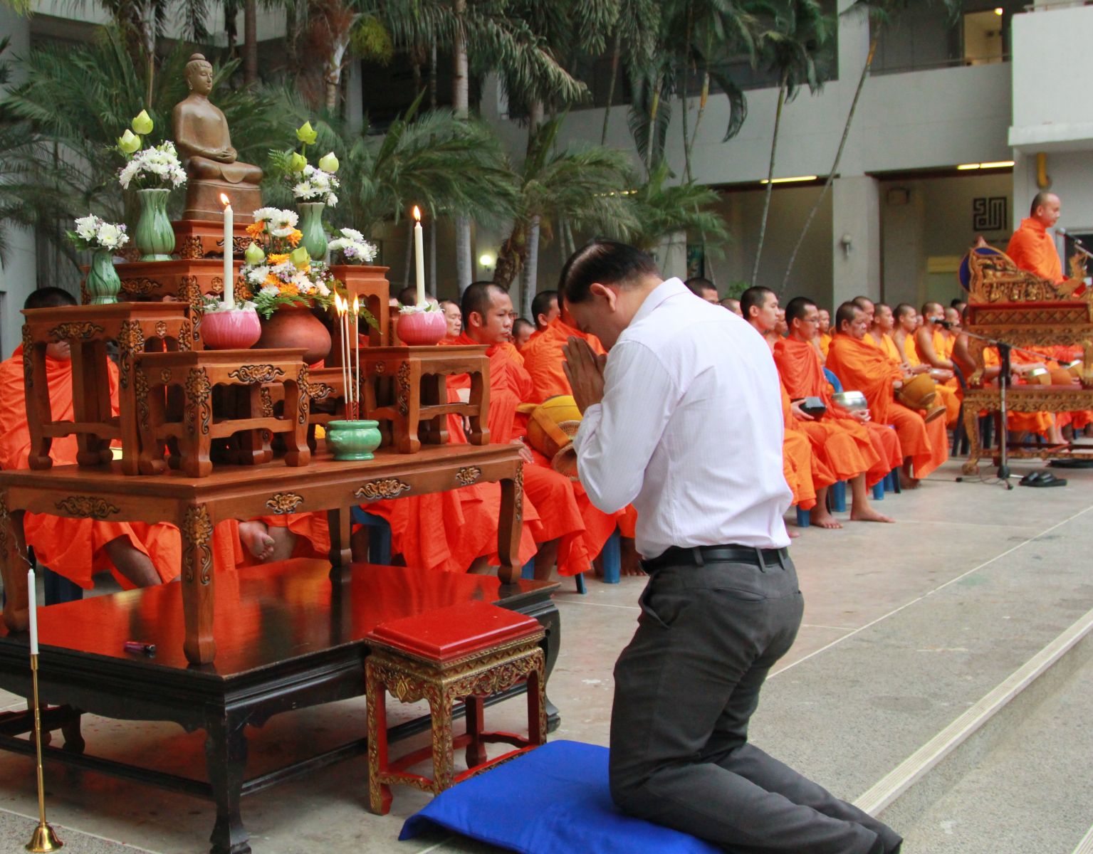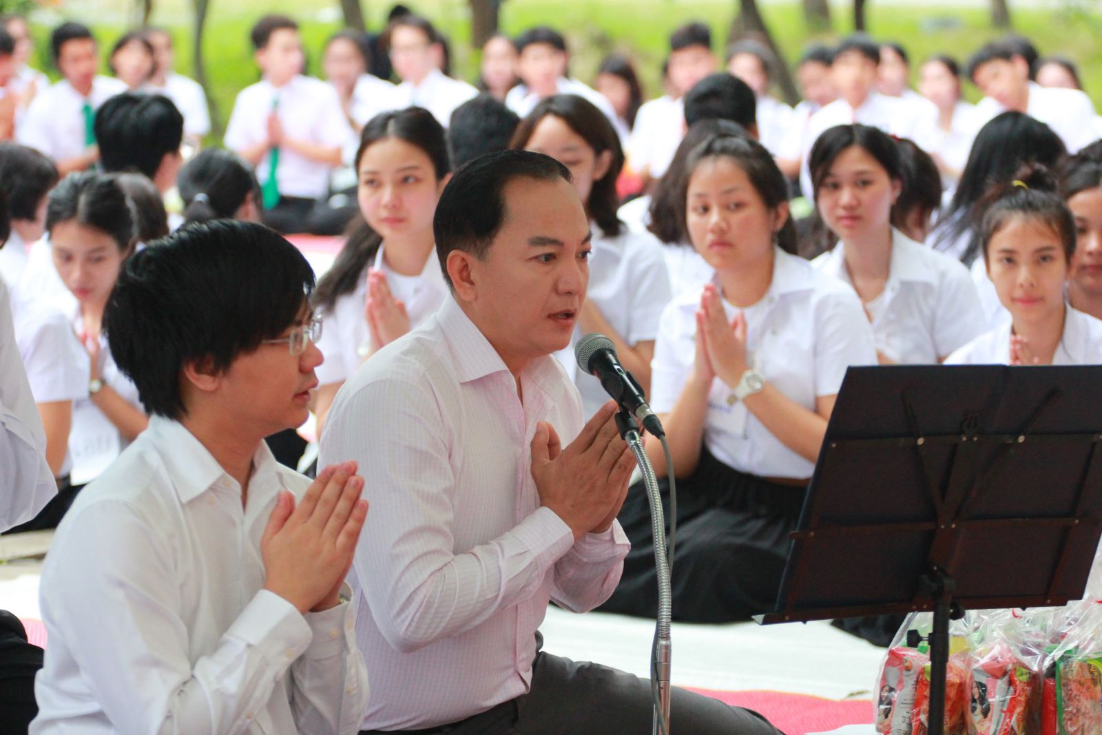 ตัวแทนนำกล่าวคำถวายภัตตาหารเป็นสังฆทานและคำอธิษฐานจิต