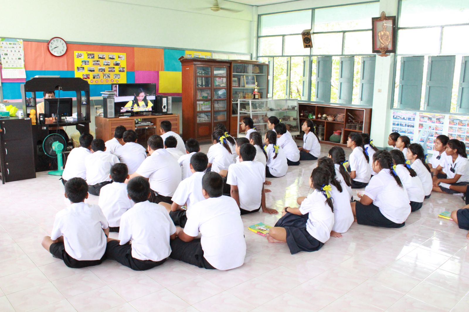 รูปที่ 6 นักเรียนโรงเรียนสามร้อยยอดกำลังดูละครฟื้นฟูศีลธรรมโลก