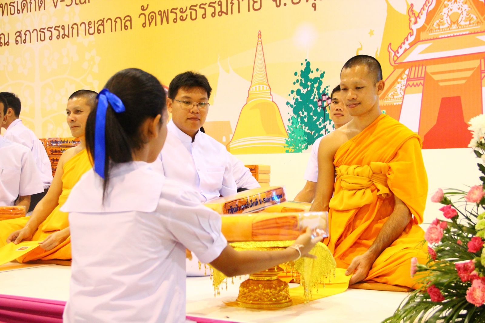 กิจกรรมในภาคบ่าย ประธานเด็กดี V-Star จะได้รับผ้าไตรประธานกฐินสัมฤทธิ์เด็กดี V-Star ประจำปี 2557จากท่านประธานสงฆ์ คือ พระครูสมุห์ธานินทร์ ปุญฺนนฺโท ผู้อำนวยการสถาบันพัฒนาเยาวชนโลก และคณะพระอาจารย์จากชมรมพุทธศาสตร์สากลฯ