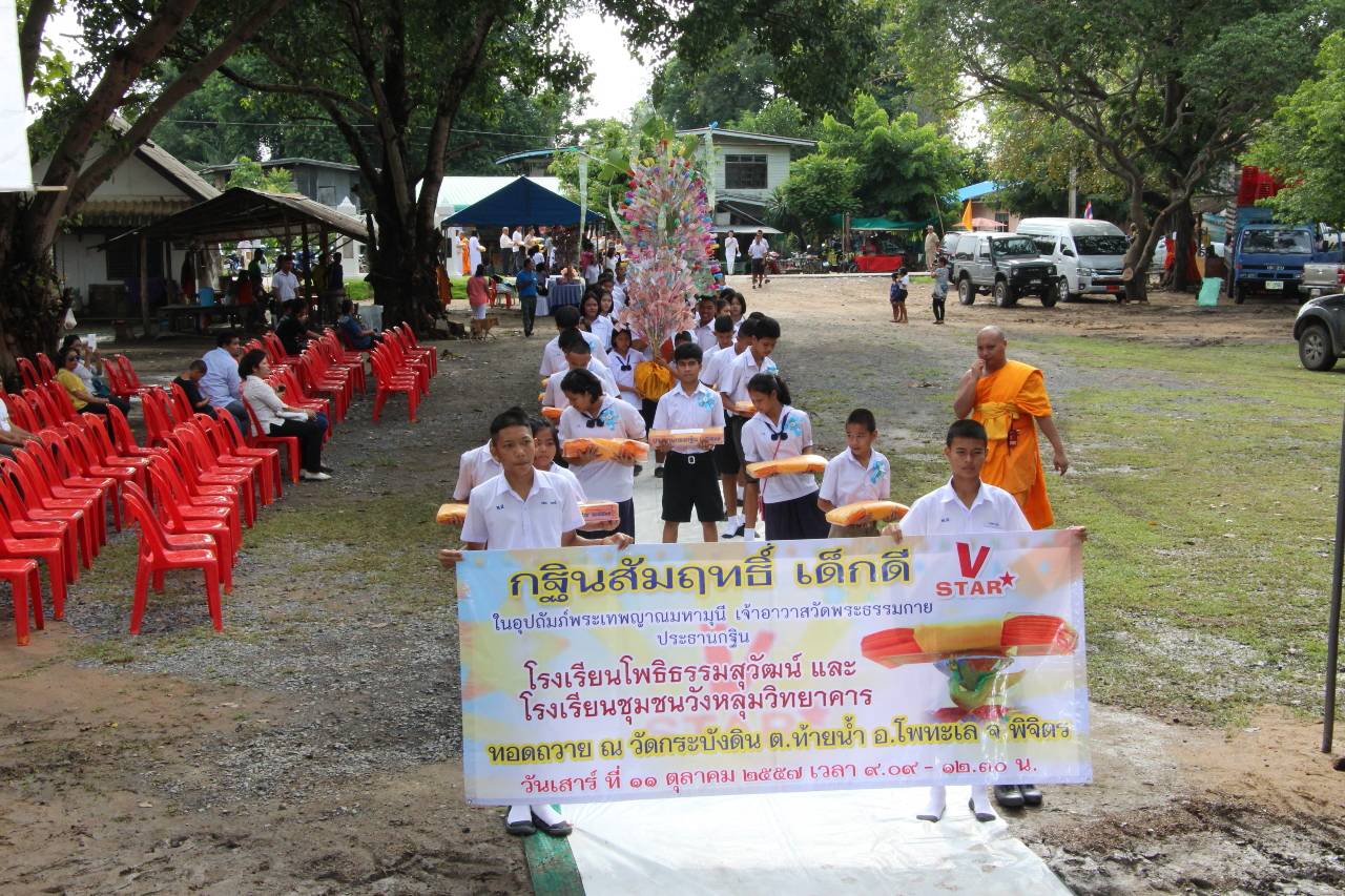 วันที่ 11 ตุลาคมที่ผ่านมา เด็กดี V-Star โรงเรียนโพธิธรรมสุวัฒน์ ร่วมกับโรงเรียนชุมชนวังหลุมวิทยาคาร จ.พิจิตร ได้จัดกิจกรรมทอดกฐินสัมฤธิ์เด็กดี V-Star ณ วัดกะบังดิน ตำบลท้ายน้ำ อำเภอโพทะเล จังหวัดพิจิตร มีวัตถุประสงค์เพื่อ ปลูกจิตสำนึกรักพระพุทธศาสนาให้แก่เยาวชน พร้อมทั้งเป็นการรวมพลังกันทอดผ้ากฐินถวายวัดต่าง ๆ และเพื่อส่งเสริมการพัฒนาวัดใกล้ร้างให้เจริญรุ่งเรือง