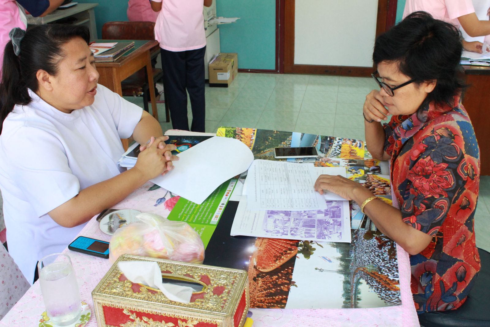ผู้ประสานงานกำลังอธิบายและเชิญชวนโรงเรียนมาต้อนรับพระธุดงค์ธรรมชัยปี 58