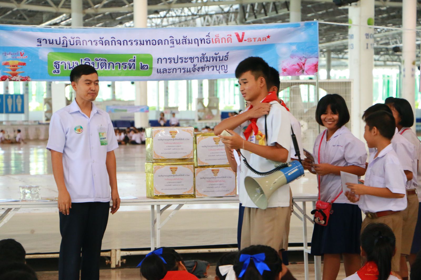 ฐานที่2 การประชาสัมพันธ์และการแจ้งข่าวบุญ โดยการฝึกให้นักเรียนเด็กดี V-star ได้ลองทำหน้าที่ให้การประชาสัมพันธ์ แจ้งข่าวบุญในชุมชน มีอุปกรณ์ดังนี้ ใบปลิว กล่องร่วมทำบุญ และ โทรโข่ง และเพื่อเป็นการดึงดูดความสนใจ เวลาไปประชาสัมพันธ์ในชุมชน จึงได้ใช้วงดุริยางค์/กลองแต๊กเข้ามาช่วยในการแจ้งข่าวบุญด้วย