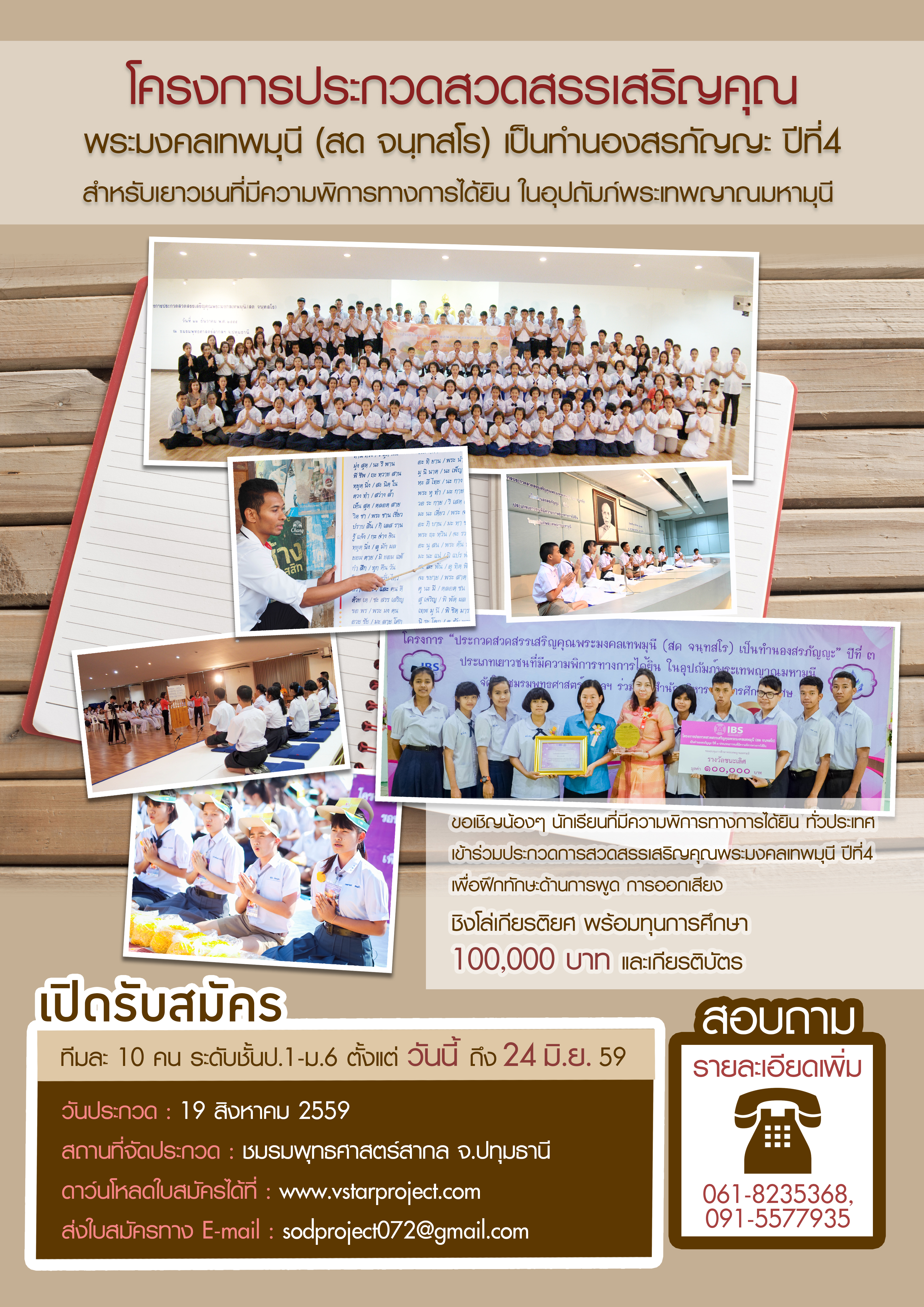 เปิดรับสมัคร นักเรียนที่มีความพิการทางการได้ยิน เข้าร่วม โครงการประกวดสวดสรรเสริญคุณพระมงคลเทพมุนี (สด จนฺทสโร) เป็นทำนองสรภัญญะ ปีที่ ๔ |
