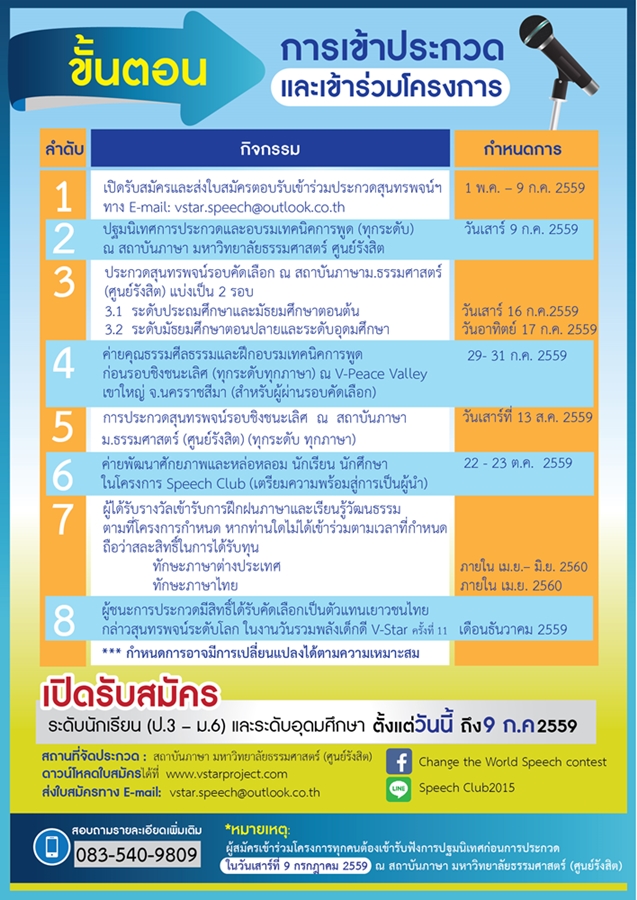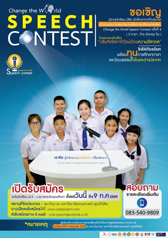 | หัวข้อ | โครงการประกวดสุนทรพจน์เพื่อการเปลี่ยนแปลงโลก(Speech Contest)ครั้งที่ 4/2559 เปิดรับสมัครจำนวนจำกัดตั้งแต่วันนี้ - 9 ก.ค.59 |