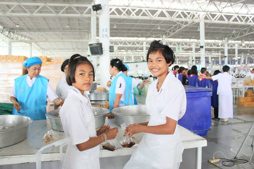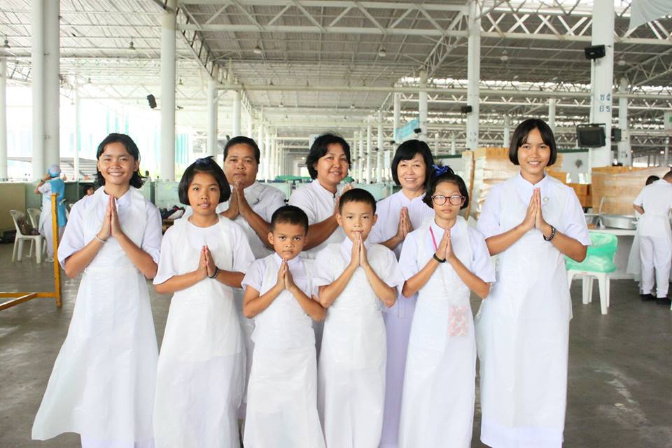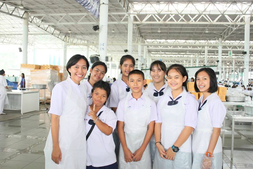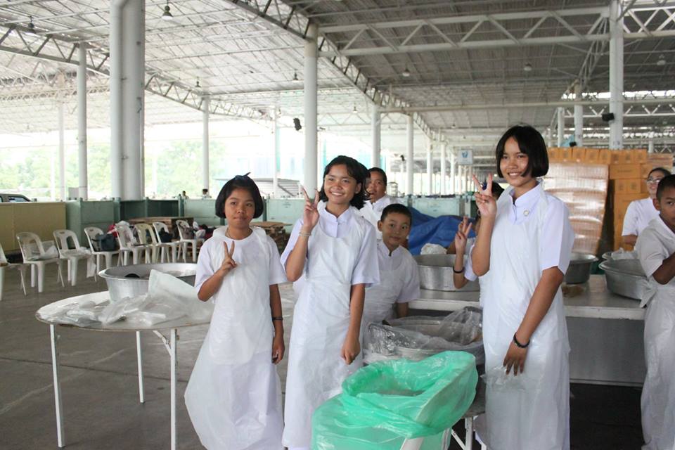 และครูผู้ประสานงานโครงการฟื้นฟูศีลธรรมโลก ภาคตะวันออก นำนักเรียนเด็กดี V-Star มาเป็นอาสาสมัครจัดโภชนาการแจกอาหารสาธุชน
