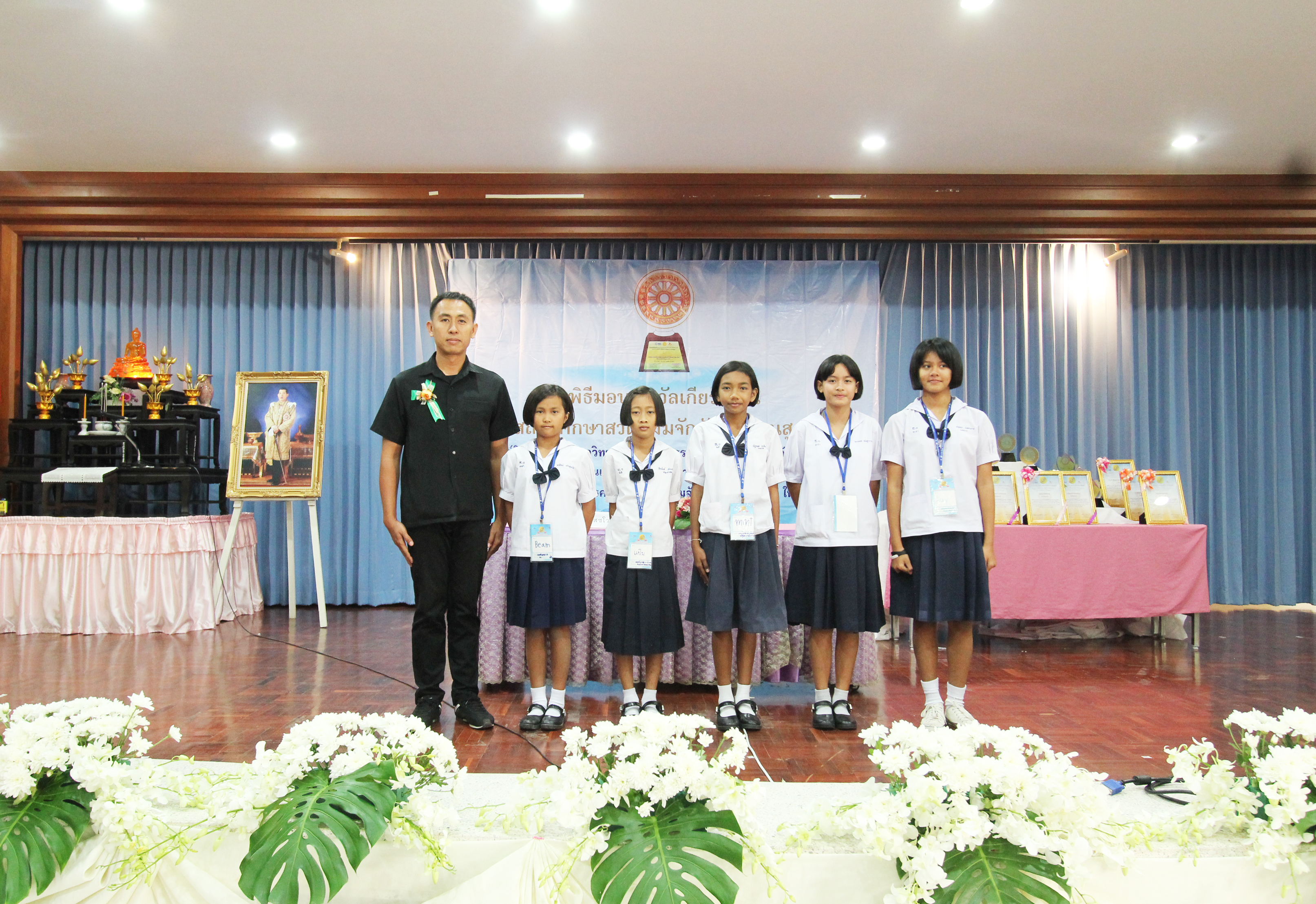 ช่วงเวลาที่ทุกคนรอคอยก็มาถึงคือ พิธีมอบรางวัลโล่เกียรติคุณและรางวัลเกียรติคุณบัตรสถานศึกษาสวดธัมมจักกัปปวัตตนสูตร โดยได้รับเกียรติจาก ท่านสายัณห์ พันนุกิจ รองผู้อำนวยการ สพป.เพชรบุรี เขต ๑ ประธานฆราวาสมาเป็นผู้มอบรางวัลให้สถานศึกษาต่างๆ ที่ผ่านเกณฑ์การสวดธัมมจักกัปปวัตตนสูตรในแต่ละระดับ