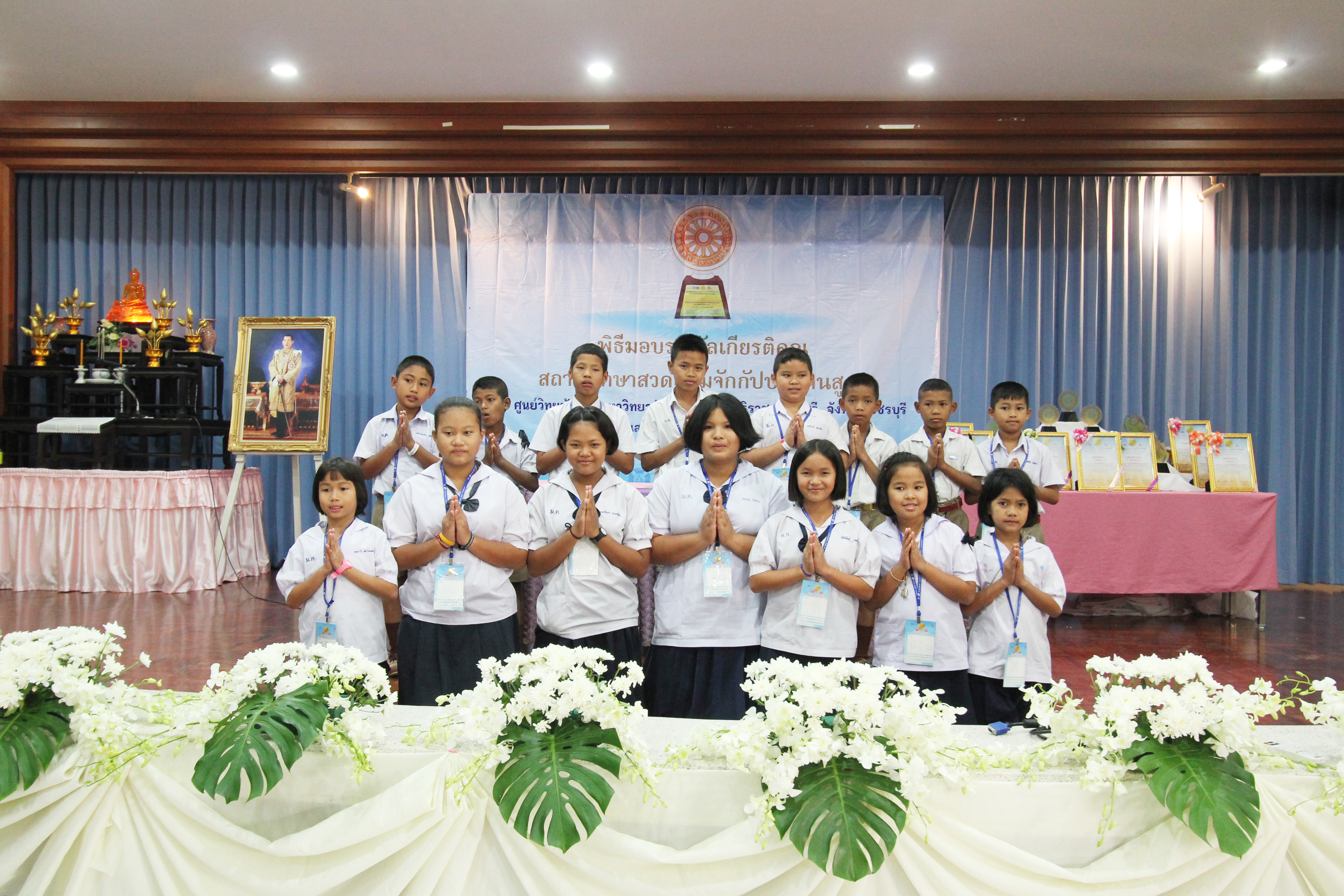 พระประธานส่งเสริมศีลธรรมจังหวัดเพชรบุรี มาเป็นประธานสงฆ์และท่านสายัณห์ พันนุกิจ รองผู้อำนวยการ สพป.เพชรบุรี เขต ๑ มาเป็นประธานฆราวาสเปิดงานและมอบรางวัลในครั้งนี้