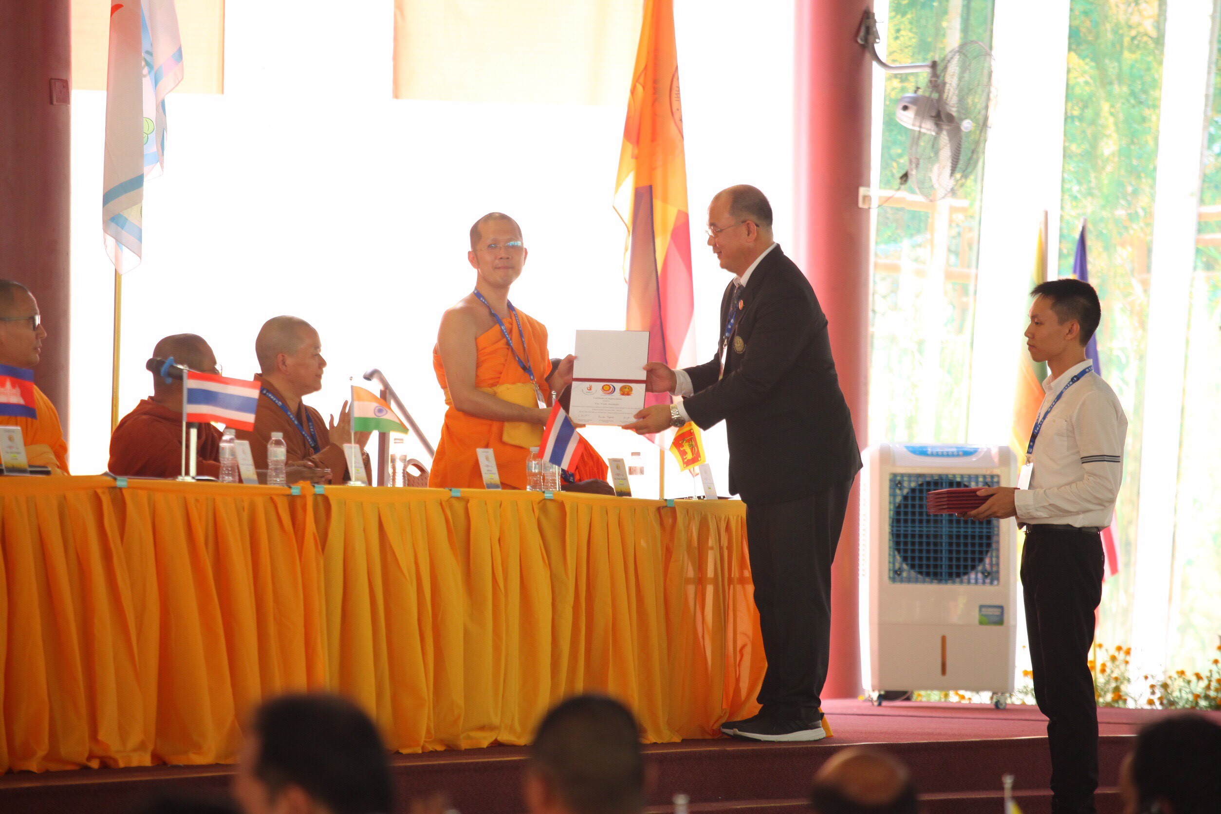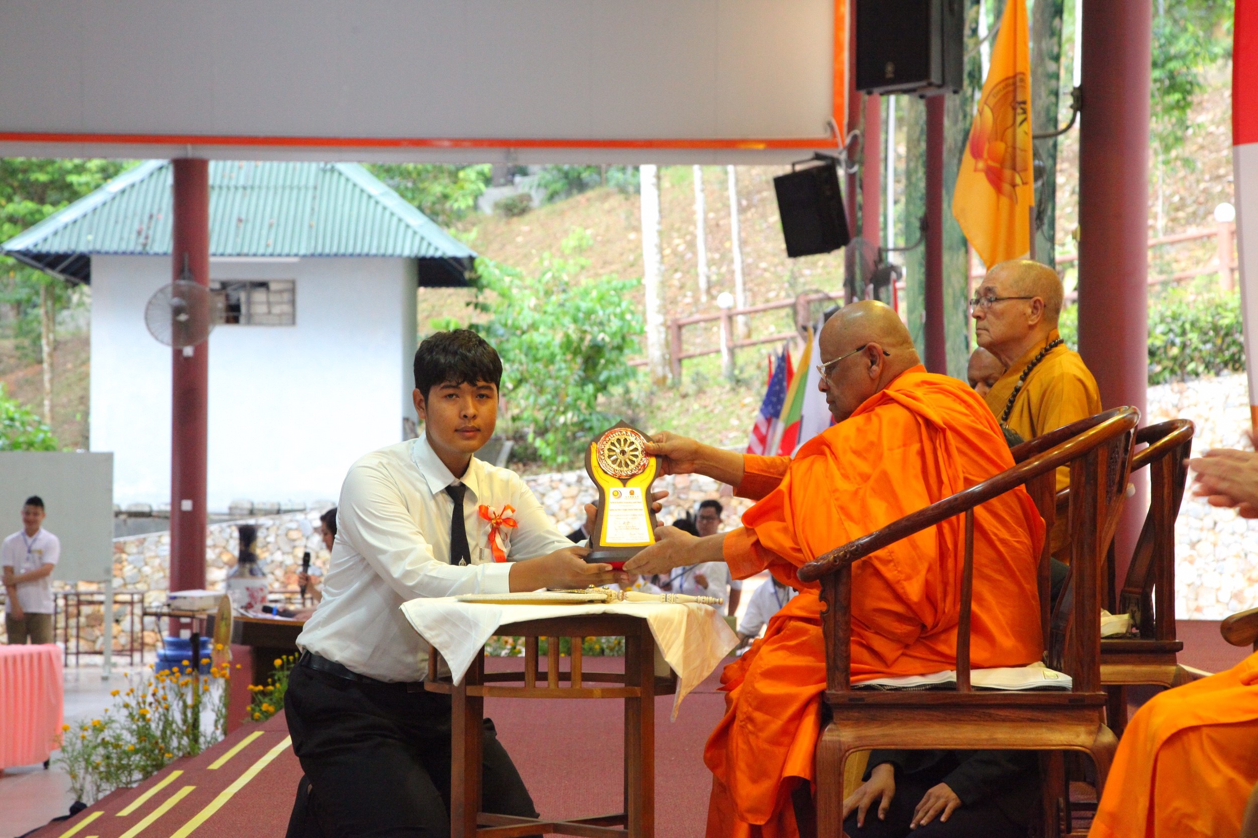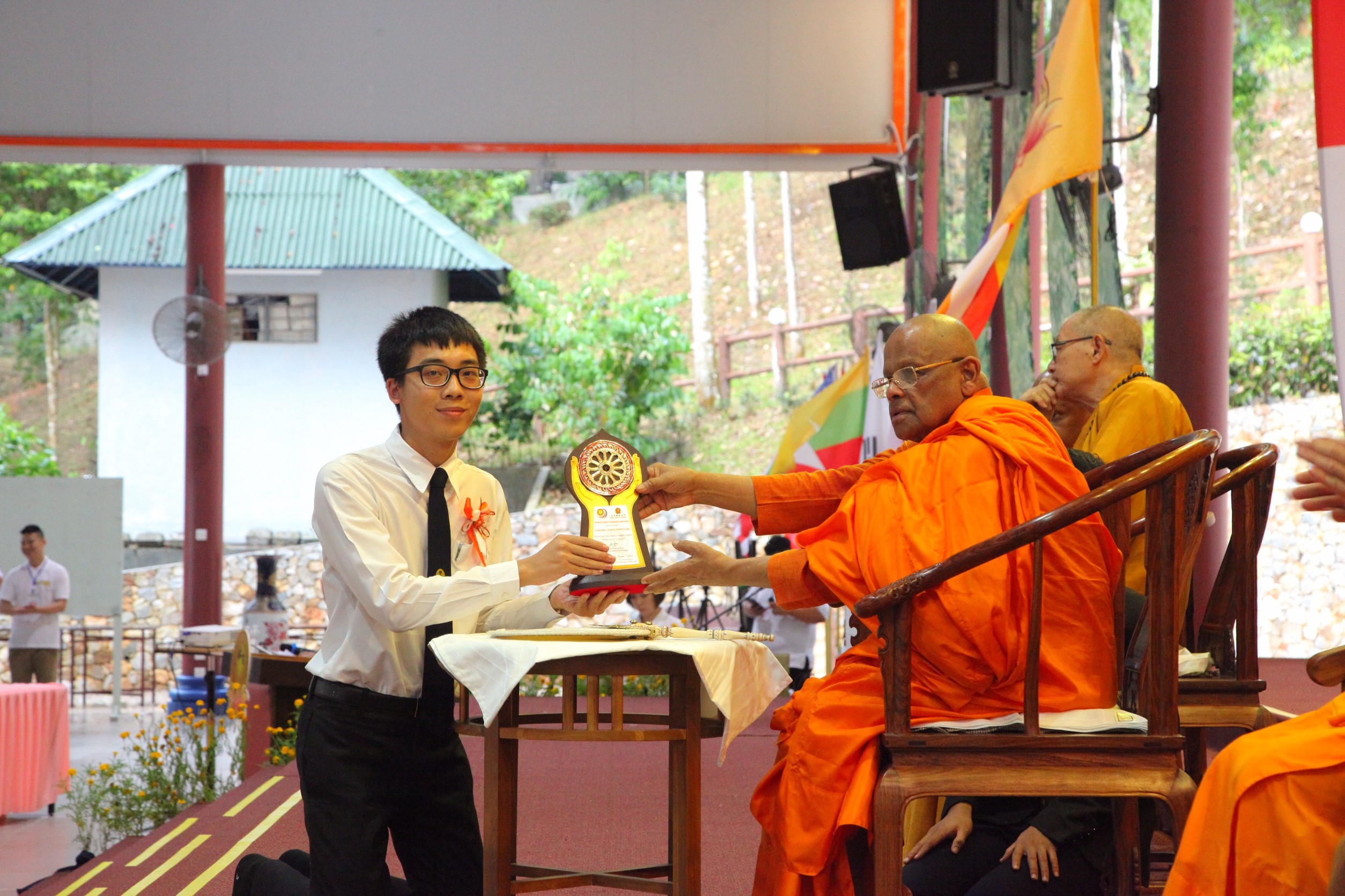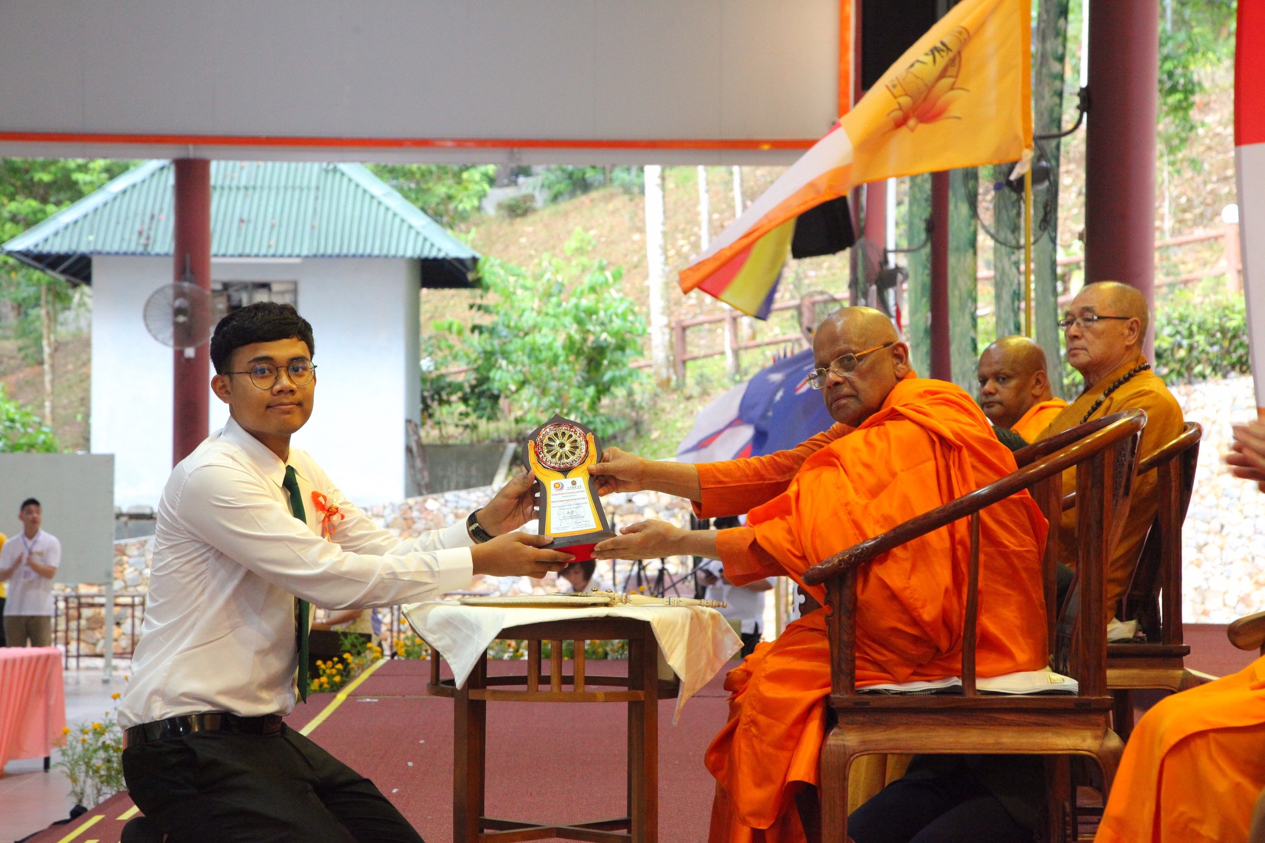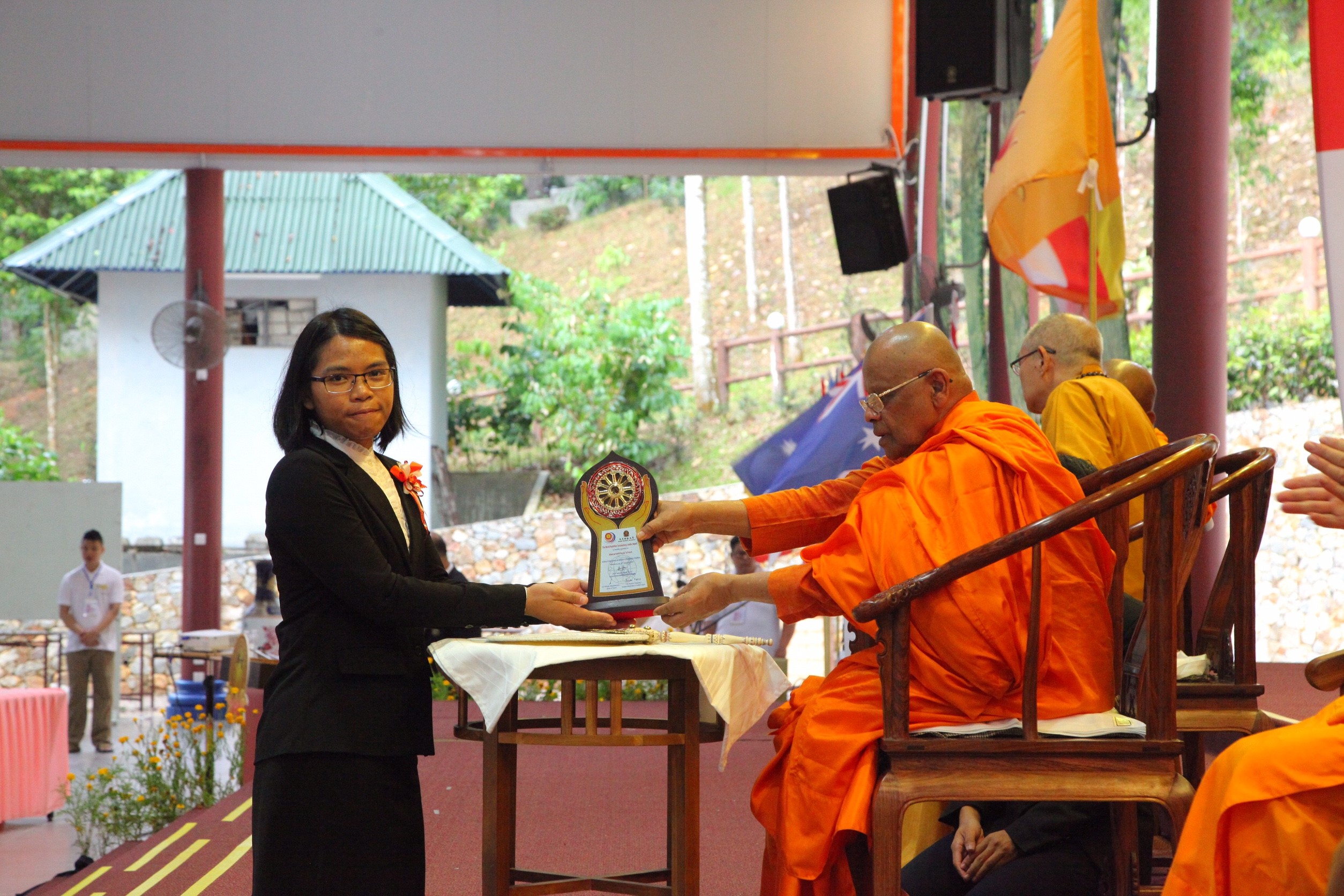 ต่อจากนั้นผู้แทนเครือข่ายชมรมพุทธศาสตร์สากลฯ เข้ารับโล่รางวัล "ยุวพุทธโลก และผู้นำพุทธโลก"