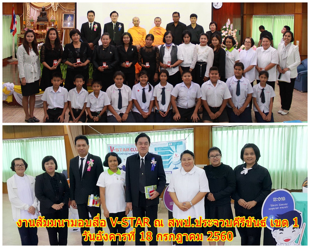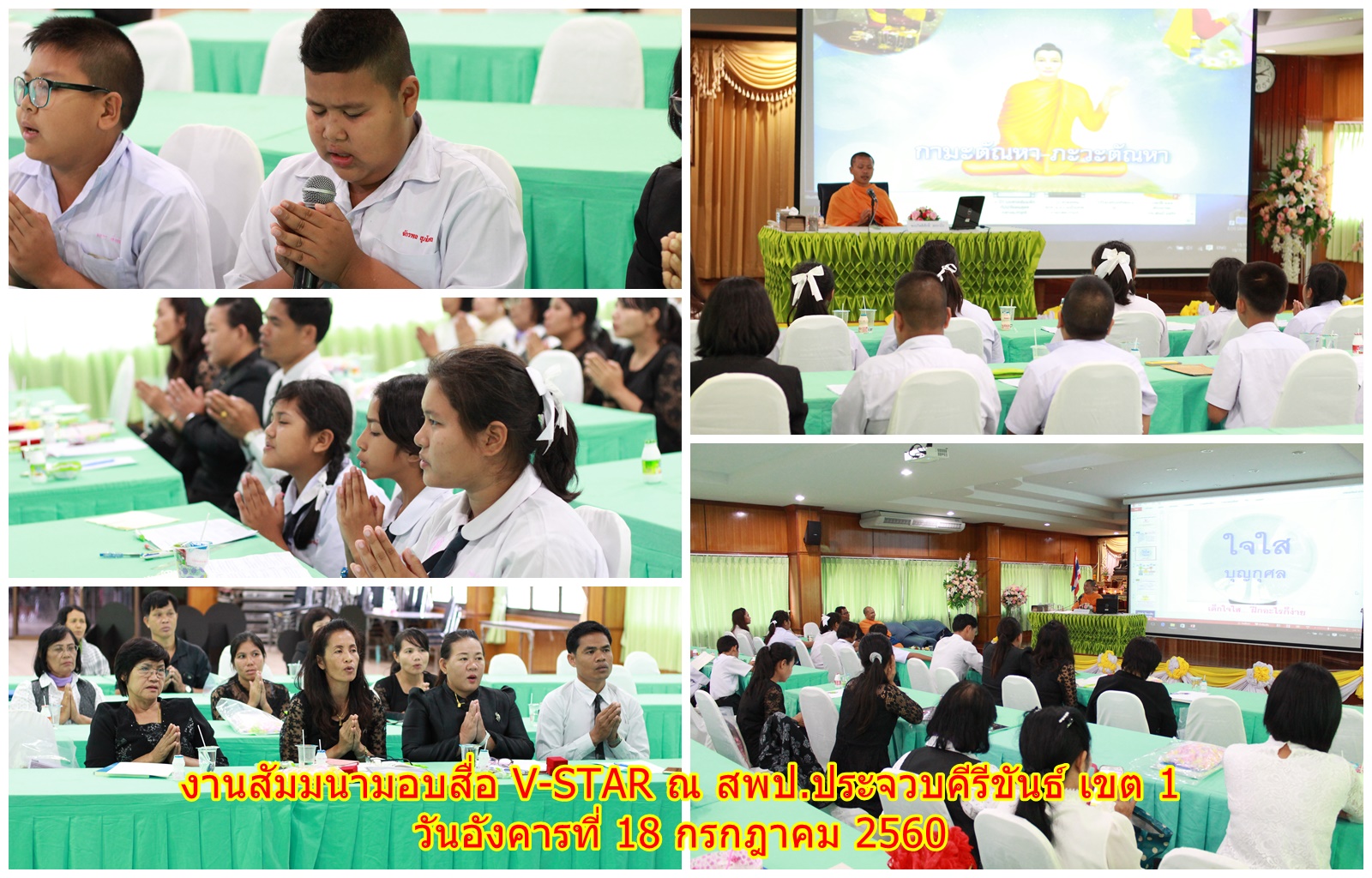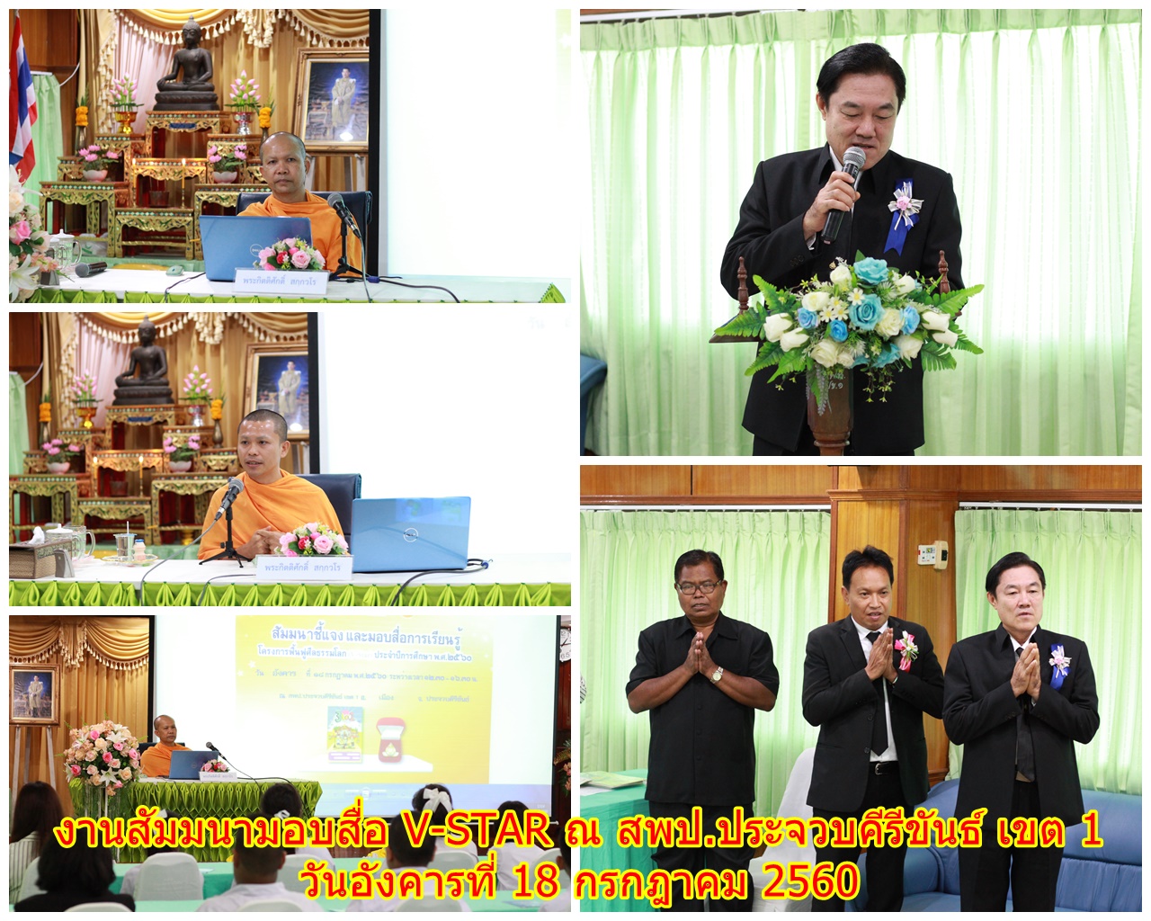 งานสัมมนามอบสื่อ V-STAR ณ สำนักงานเขตพื้นที่การศึกษาประถมศึกษาประจวบคีรีขันธ์ เขต 1 โดยได้รับความเมตตาจาก “พระอาจารย์สุรศักดิ์ สุรสกฺโก พระประธานจังหวัด” มาเป็นประธานสงฆ์และมอบเข็มเกียรติยศ โดยมี “พระอาจารย์กิตติศักดิ์ สกฺกวโร” เป็นพระอาจารย์ชี้แจงรายละเอียดโครงการ V-STAR และนำคณะครูและนักเรียนสวดธัมมจักกัปปวัตตนสูตร