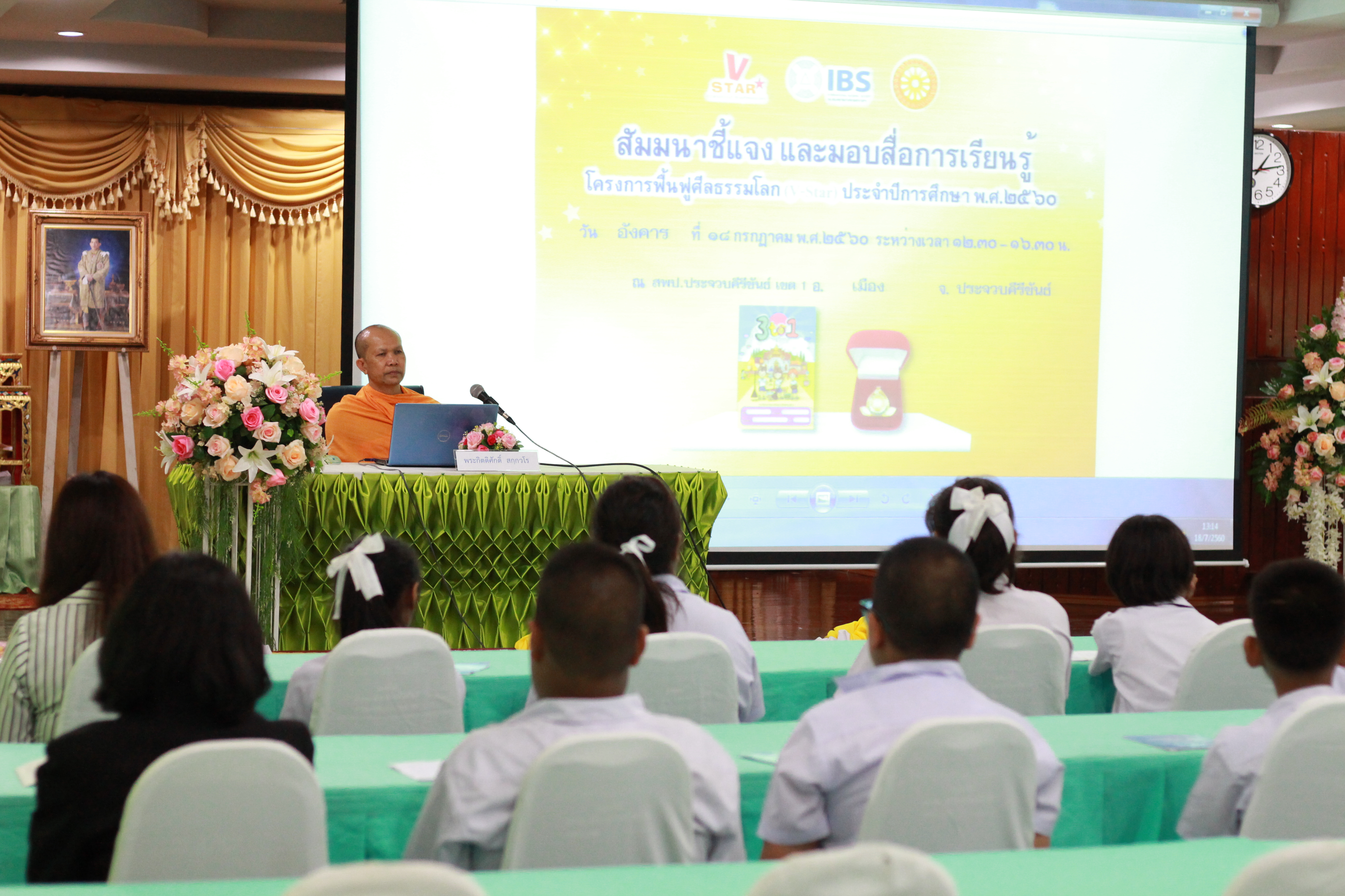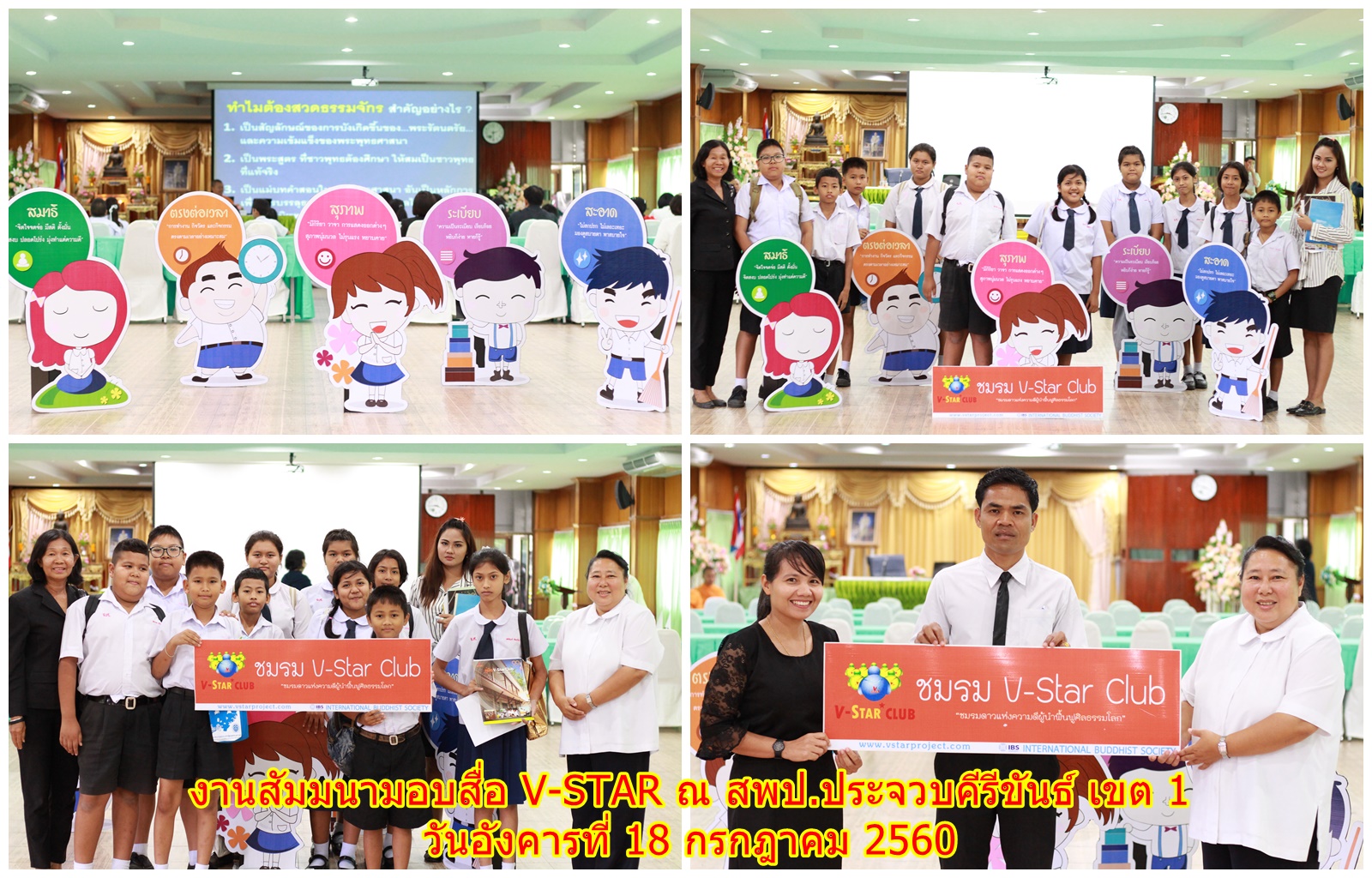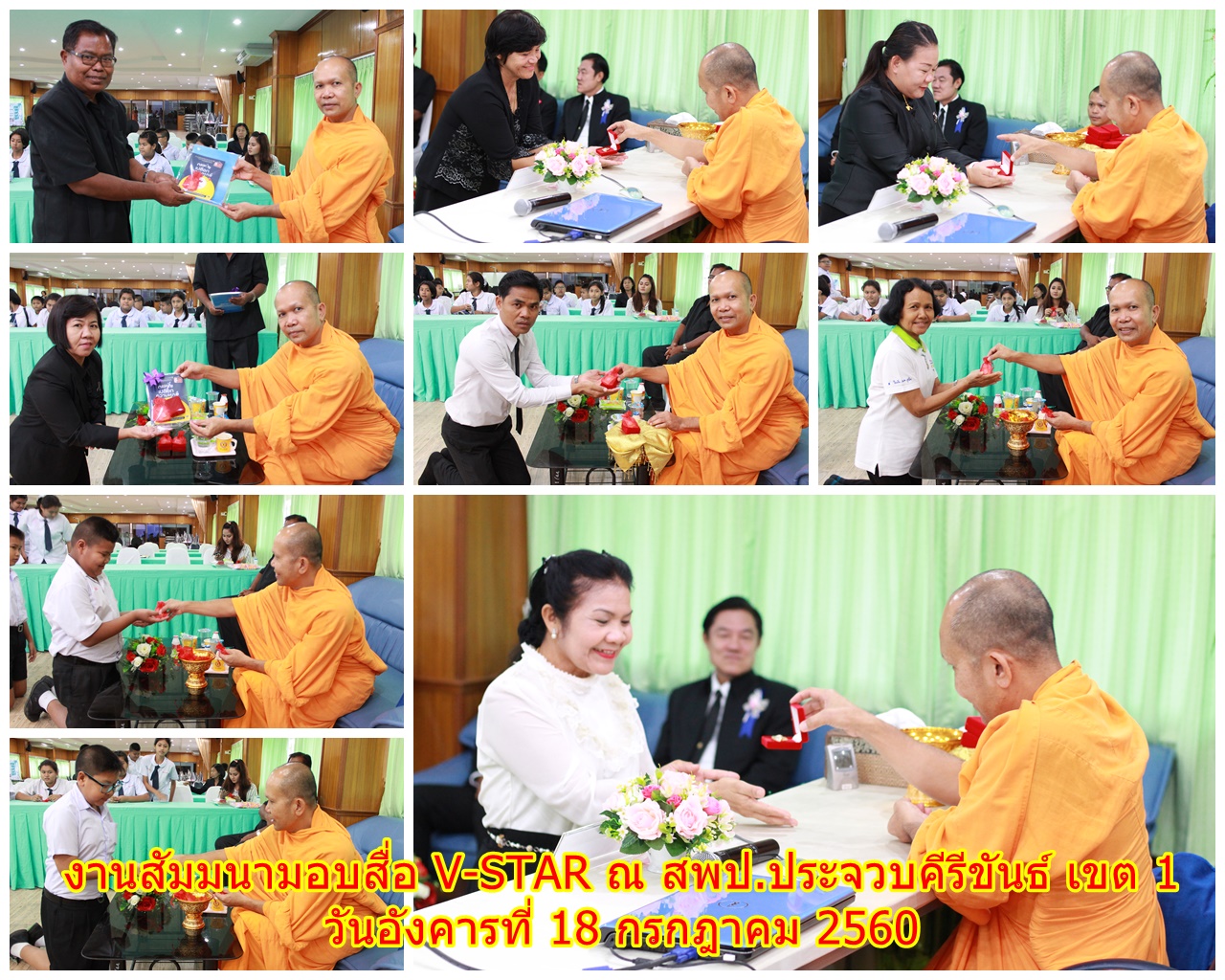 งานสัมมนามอบสื่อ V-STAR ณ สำนักงานเขตพื้นที่การศึกษาประถมศึกษาประจวบคีรีขันธ์ เขต 1 โดยได้รับความเมตตาจาก “พระอาจารย์สุรศักดิ์ สุรสกฺโก พระประธานจังหวัด” มาเป็นประธานสงฆ์และมอบเข็มเกียรติยศ โดยมี “พระอาจารย์กิตติศักดิ์ สกฺกวโร” เป็นพระอาจารย์ชี้แจงรายละเอียดโครงการ V-STAR และนำคณะครูและนักเรียนสวดธัมมจักกัปปวัตตนสูตร