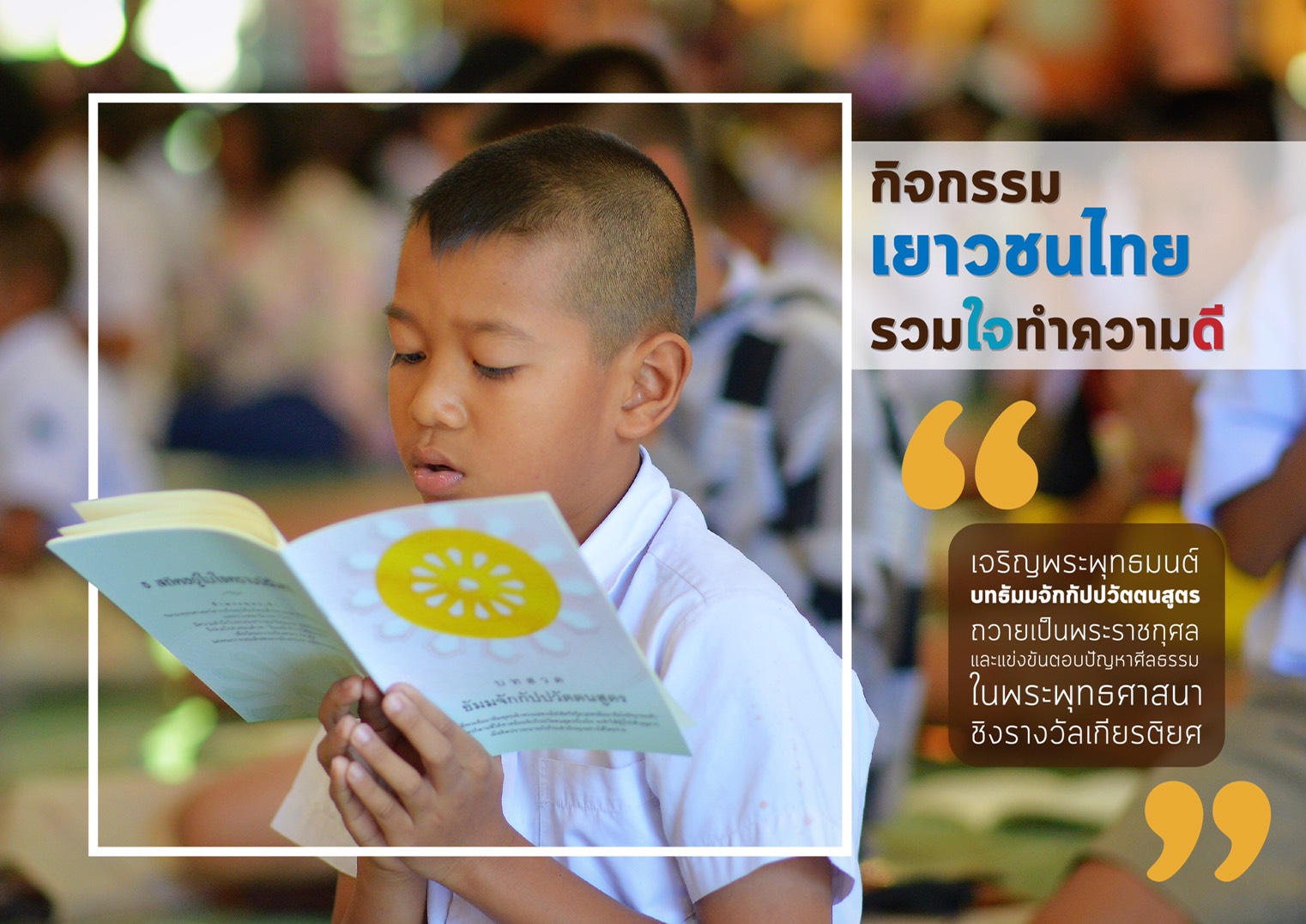 | หัวข้อ | “กิจกรรมเยาวชนไทยรวมใจทำความดี เจริญพระพุทธมนต์บทธัมมจักกัปปวัตตนสูตรถวายเป็นพระราชกุศลและแข่งขันตอบปัญหาศีลธรรมในพระพุทธศาสนา ชิงรางวัลเกียรติยศ” |