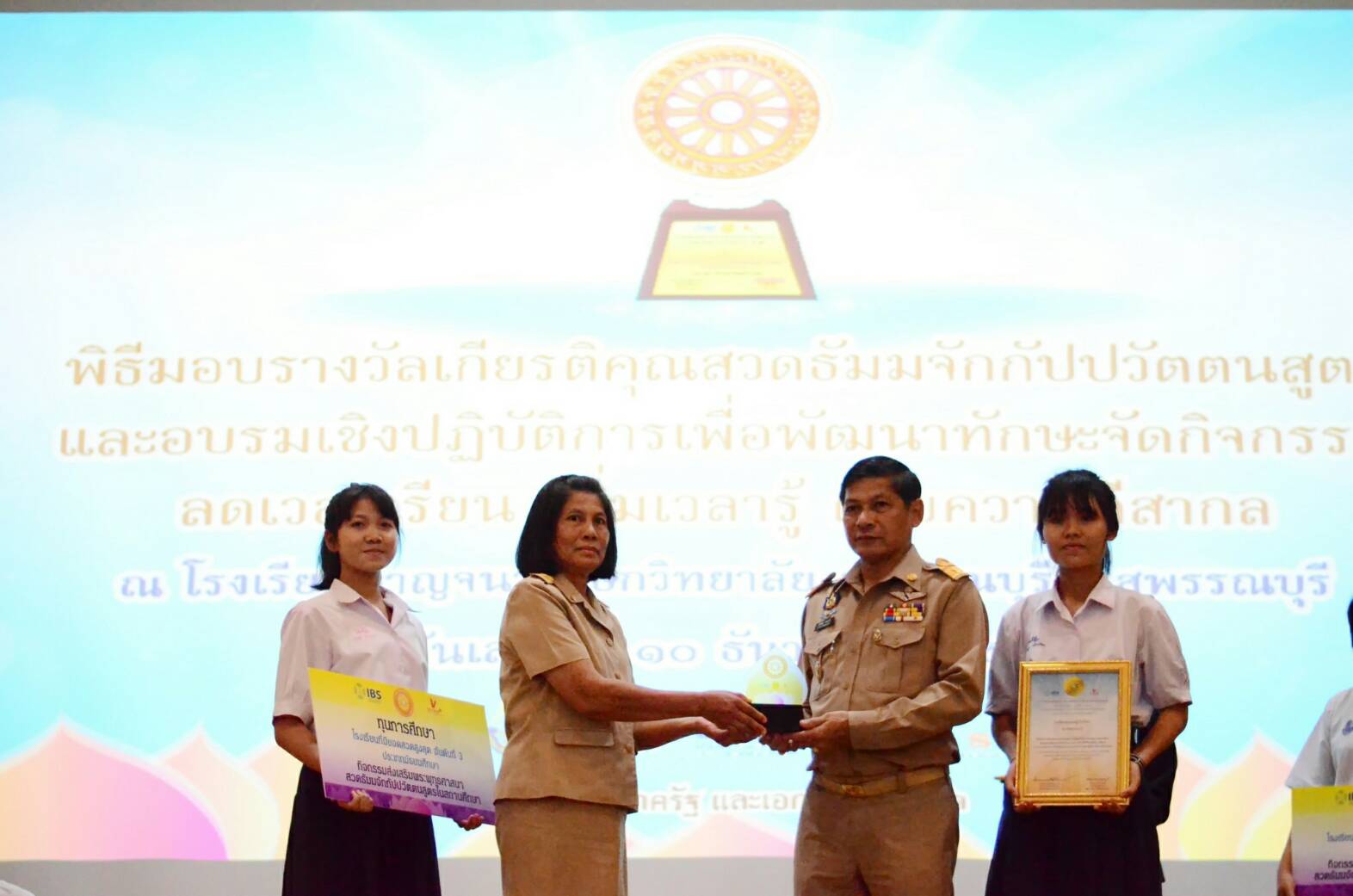 เกียรติบัตรเชิดชูเกียรติสถานศึกษาเจริญพระพุทธมนต์บทธัมมจักกัปปวัตตนสูตร ยอดสวดสูงสุดอันดับ ๓
