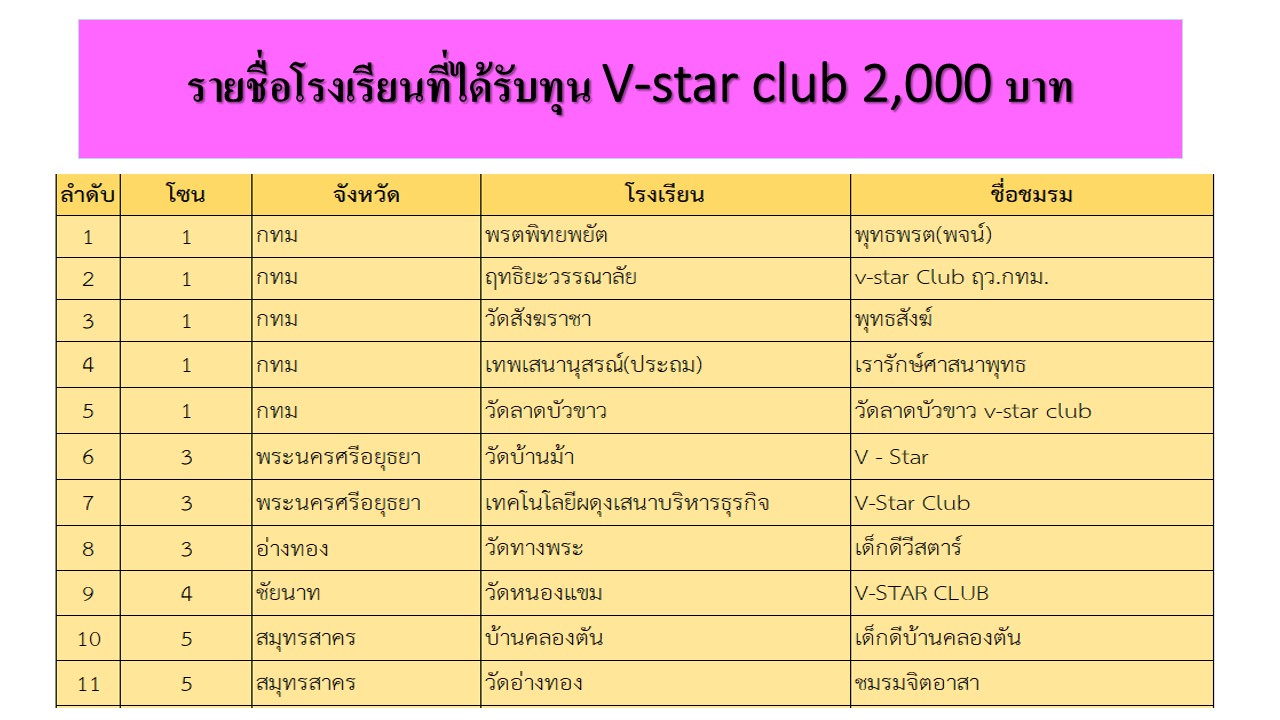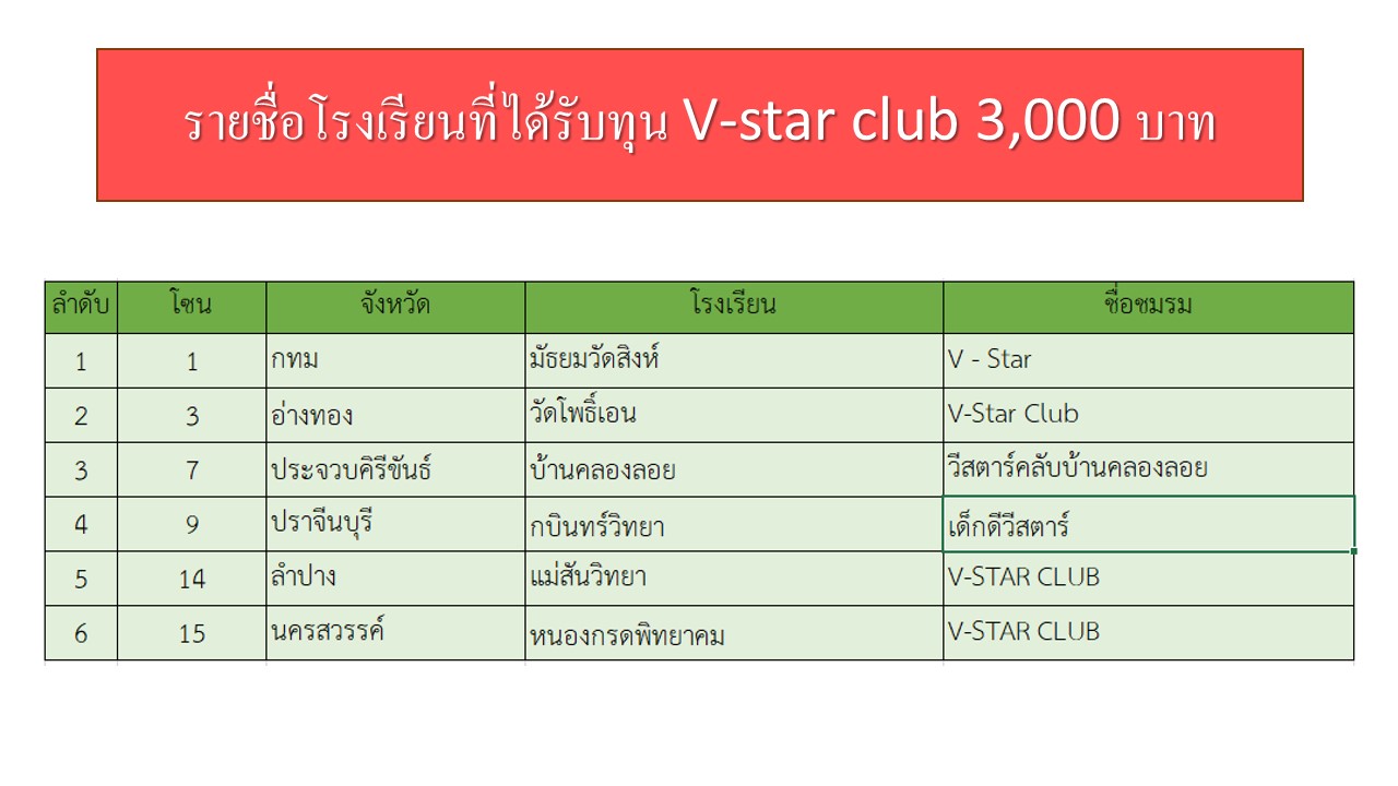 ประกาศ !! รายชื่อสถานศึกษาที่ได้รับทุนดำเนินการชมรม V-Star Club (ทั่วประเทศ) ปีการศึกษา 2560