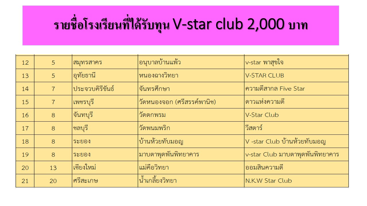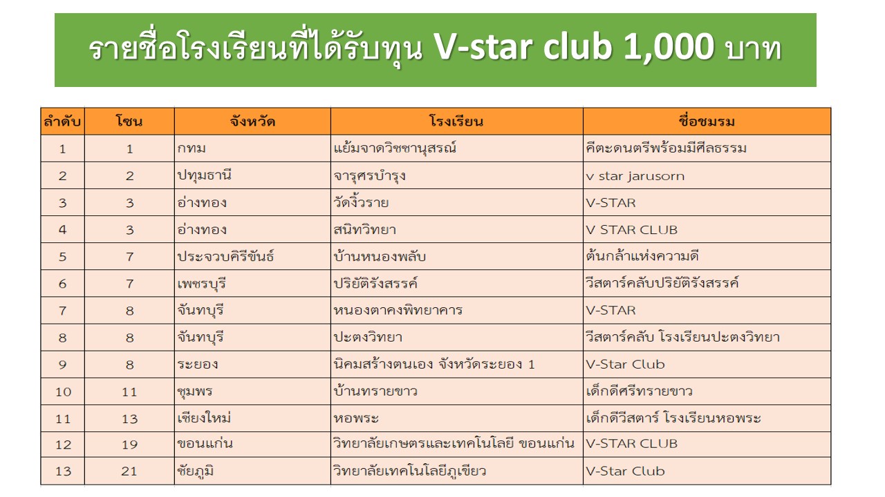 ชมรม V-Star Club เป็นแหล่งเรียนรู้ และทำกิจกรรมทางด้านศีลธรรมในโรงเรียนของเหล่าเด็กดี V-Star ณ ที่แห่งนี้ มีความรัก พร้อมบุญกุศล และความดี เสร็จสิ้นภารกิจความดีไปอีก 1 ปี ทางโครงการขอส่งมอบทุนดำเนินการชมรม V-Star Club สำหรับสถานศึกษาที่ผ่านเกณท์ เพื่อสนับสนุนการดำเนินงานชมรม และส่งเสริมให้กระแสความดีขยายสู่ใจเยาวชนเหล่าเด็กดี V-Starทั่วประเทศ ^^