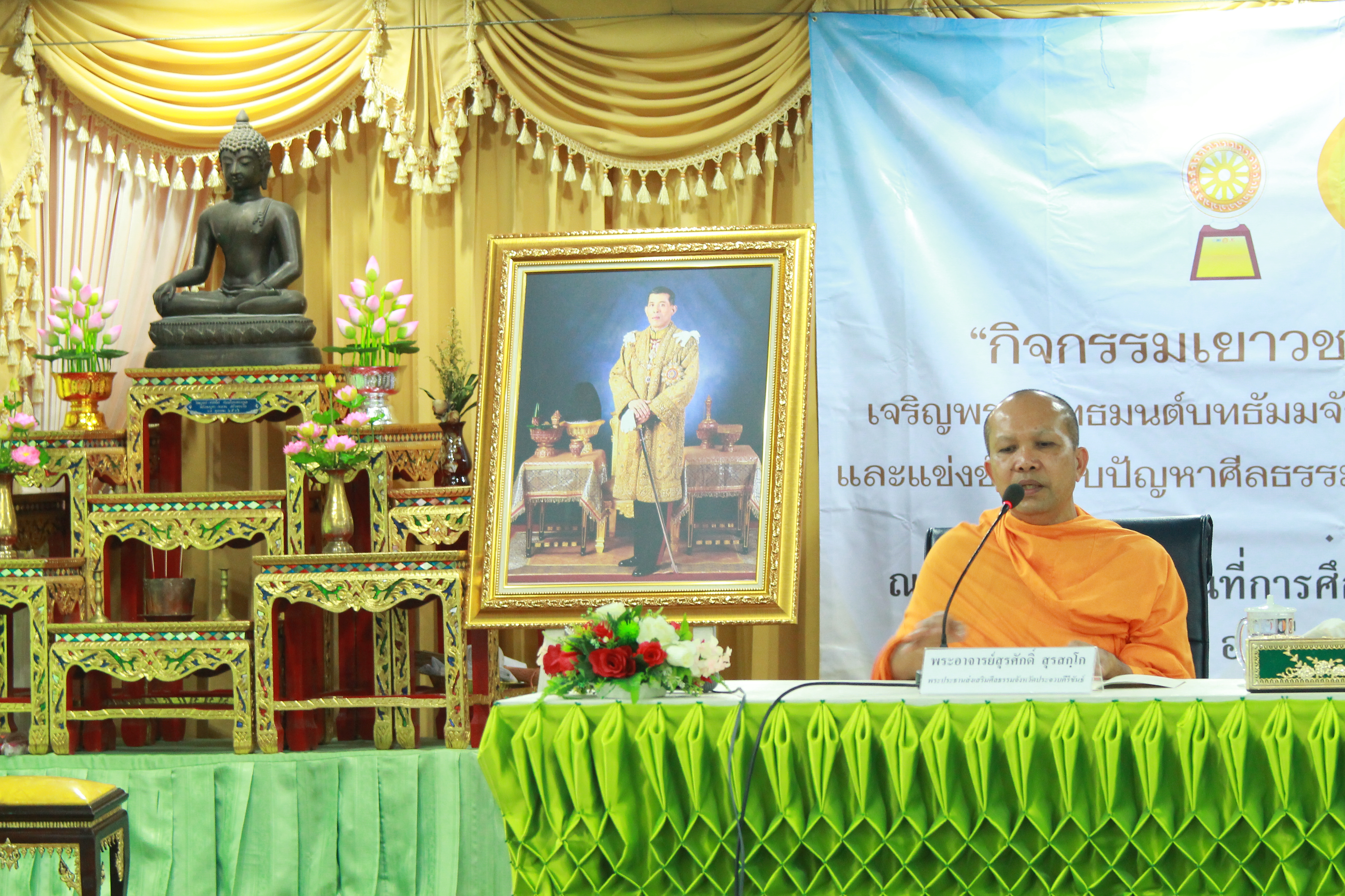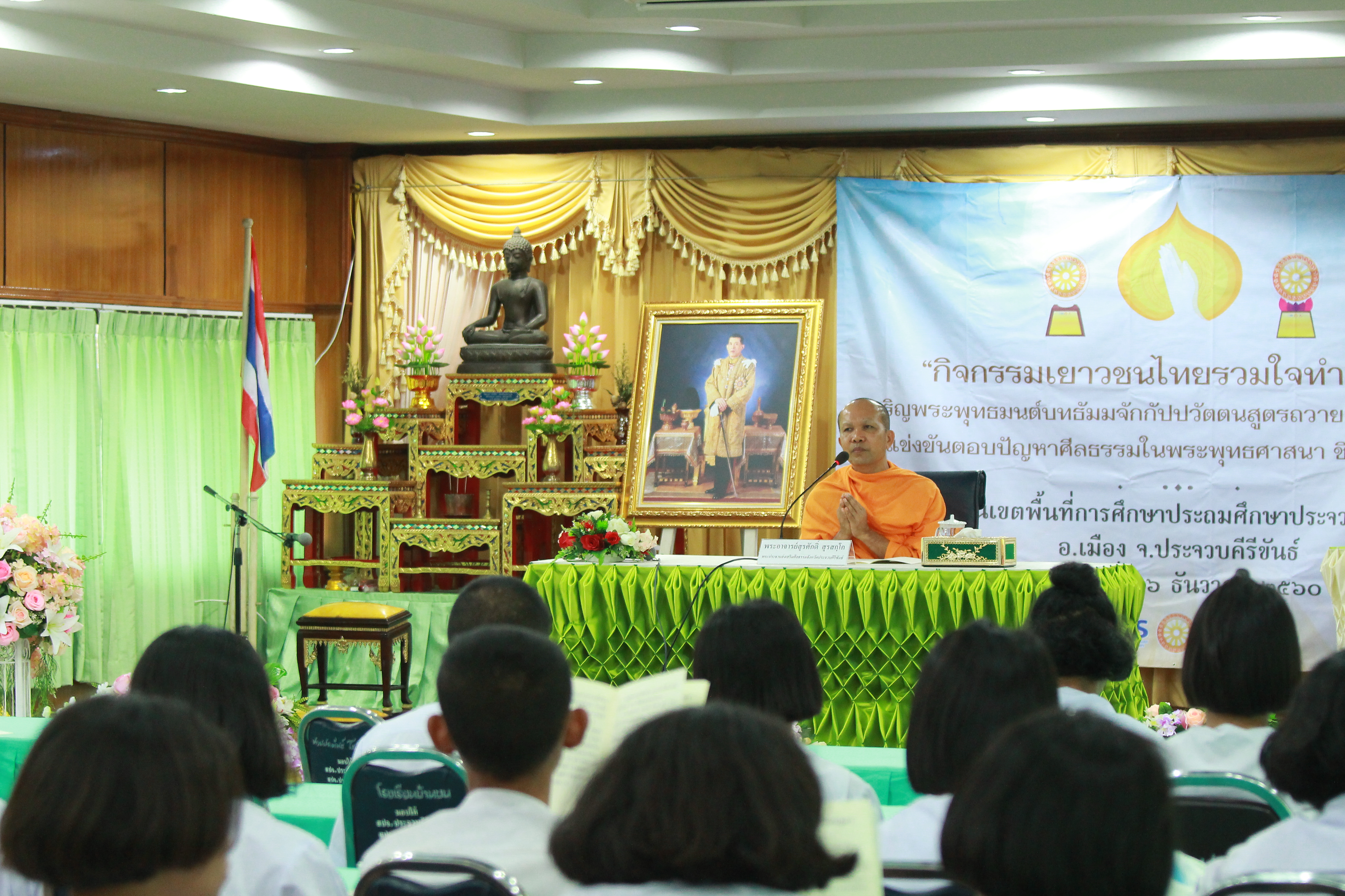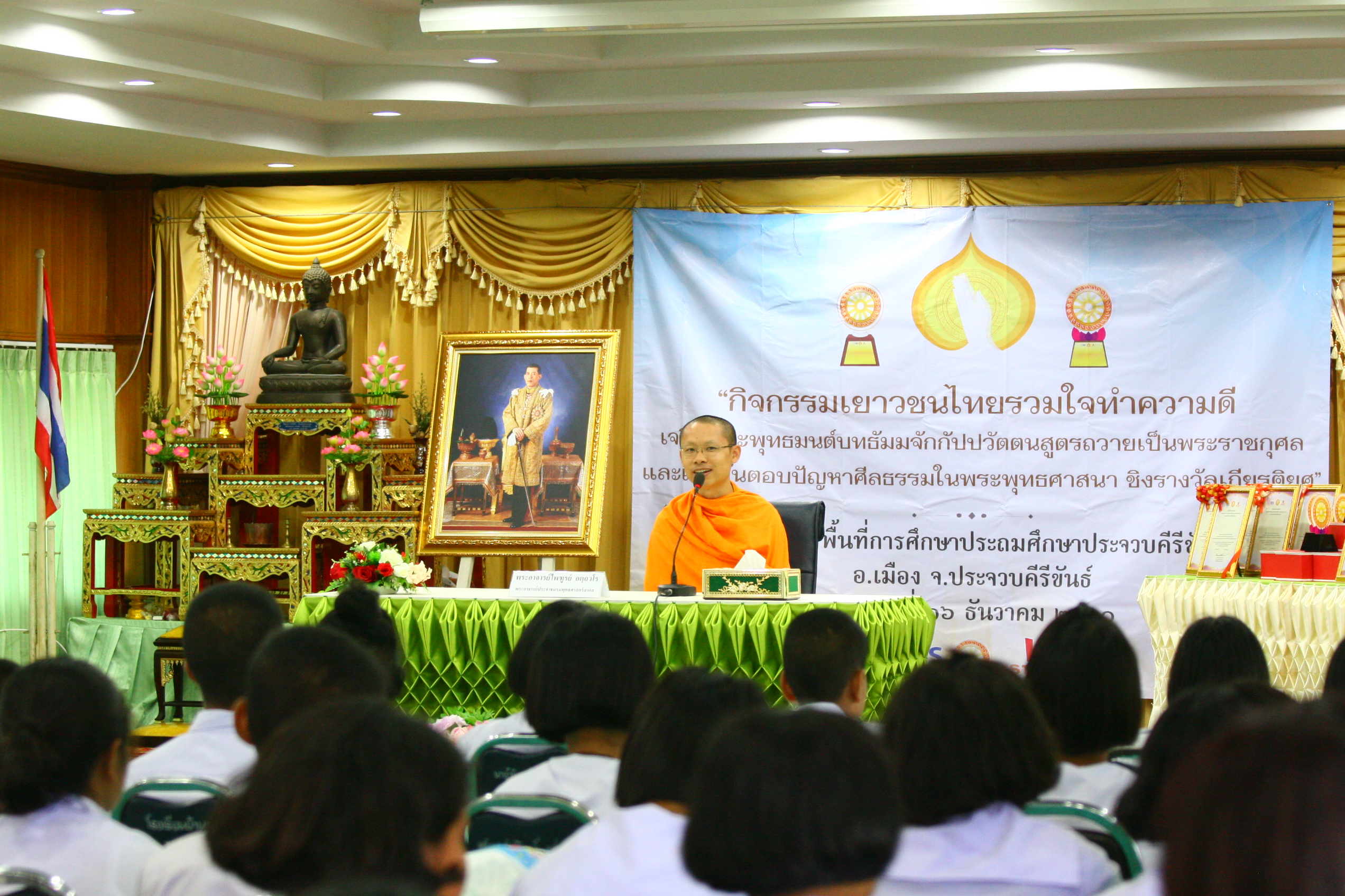 วันเสาร์ที่ 16 ธันวาคม พ.ศ.2560 ณ สำนักงานเขตพื้นที่การศึกษาประถมศึกษาประจวบคีรีขันธ์ เขต 1 อ.เมือง จ.ประจวบคีรีขันธ์ ธุดงคสถานประจวบคีรีขันธ์ โดย พระอาจารย์สุรศักดิ์ สุรสกฺโก ร่วมกับชมรมพุทธศาสตร์สากล ในอุปถัมภ์สมเด็จพระมหารัชมังคลาจารย์ และเครือข่ายองค์กรภาคี จัดกิจกรรมเยาวชนไทยรวมใจทำความดี เจริญพระพุทธมนต์บทธัมมจักกัปปวัตนสูตร ถวายเป็นพระราชกุศลและสอบตอบปัญหาศีลธรรมในพระพุทธศาสนาชิงรางวัลเกียรติยศโล่เจ้าคณะจังหวัดประจวบคีรีขันธ์โดยมีผู้เข้าร่วมกิจกรรมกว่า 200 คน จาก 15 สถานศึกษา ในจังหวัดประจวบคีรีขันธ์ เขต 1 (อ.เมือง)