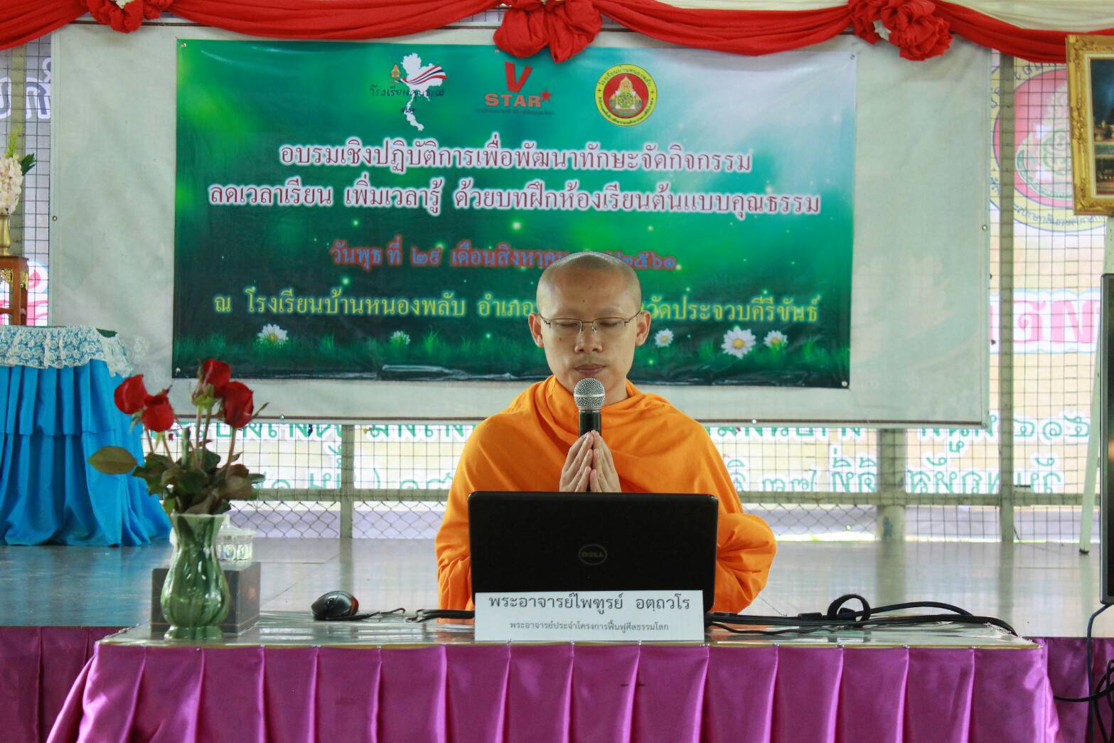 ชมรมพุทธศาสตร์สากล ได้จัดอบรมเชิงปฏิบัติการเพื่อพัฒนาทักษะจัดกิจกรรม ลดเวลาเรียน เพิ่มเวลารู้ ด้วยบทฝึกห้องเรียนต้นแบบ ในวันที่ 29 สิงหาคม 2561 ระหว่างเวลา 08.30-15.00 น. ณ ห้องประชุม โรงเรียนบ้านหนองพลับ อ.หัวหิน จ.ประจวบคีรีขันธ์ ประธานสงฆ์ คือ พระอาจารย์ไพฑูรย์ อตฺถวโร พระอาจารย์ประจำโครงการฟื้นฟูศีลธรรมโลก และประธานฆราวาส อาจารย์ อุไร บุญทรัพย์ ครูโรงเรียนบ้านหนองพลับ