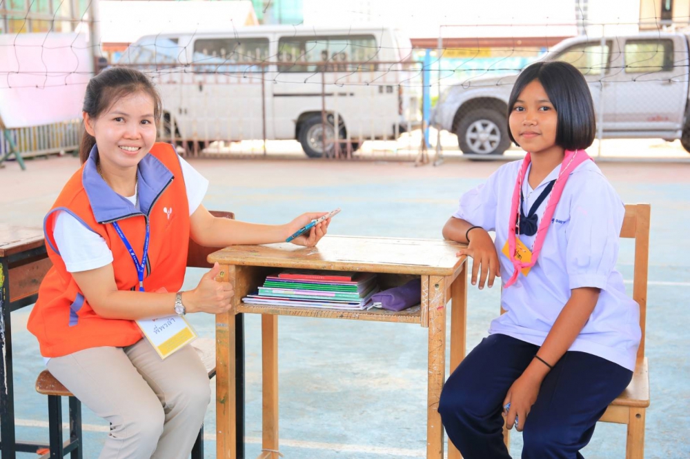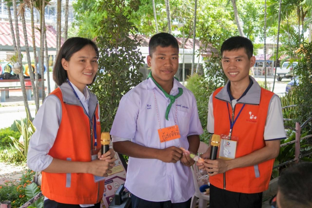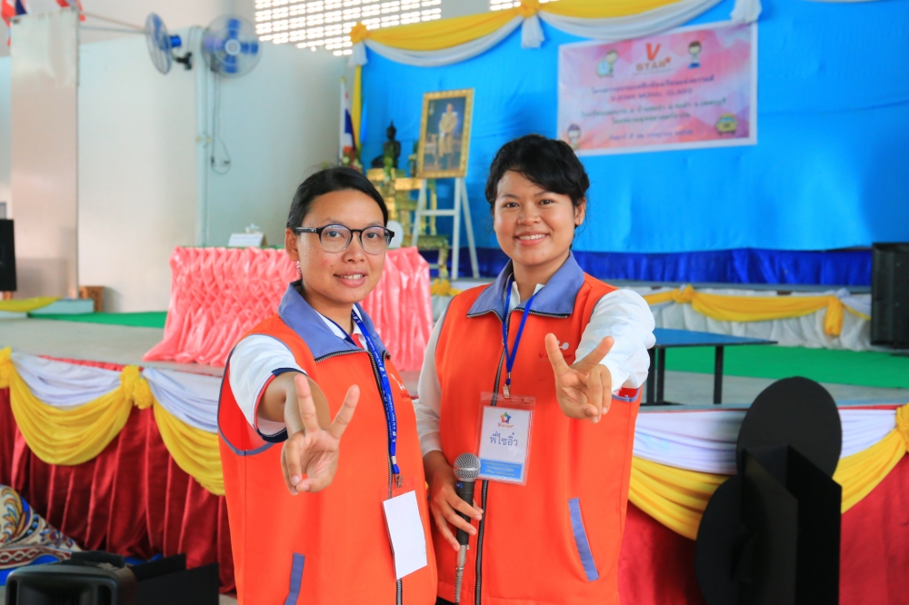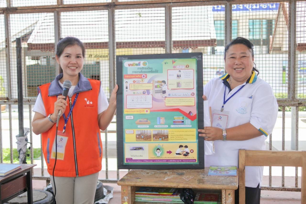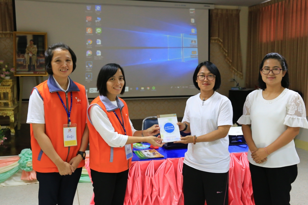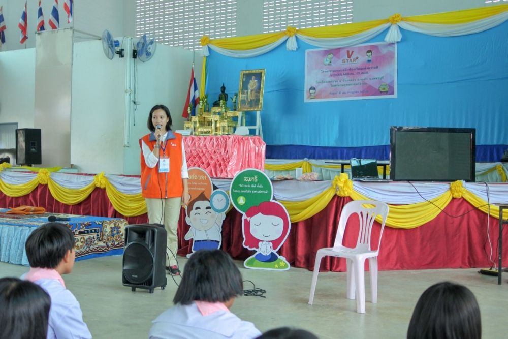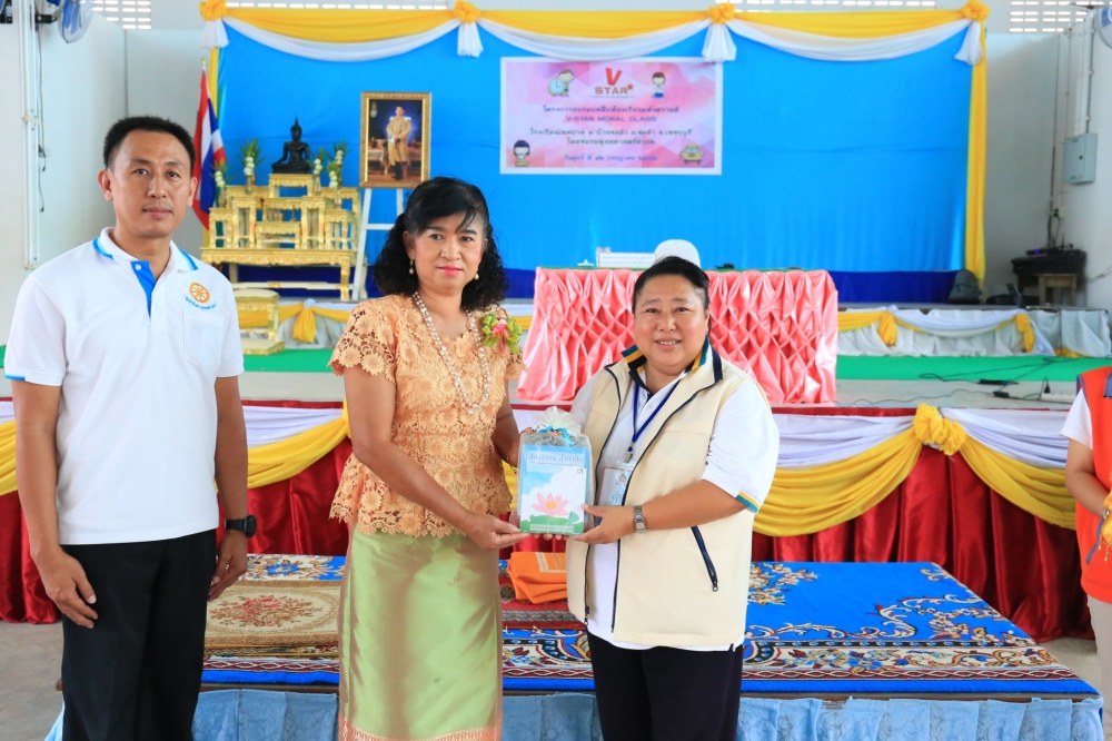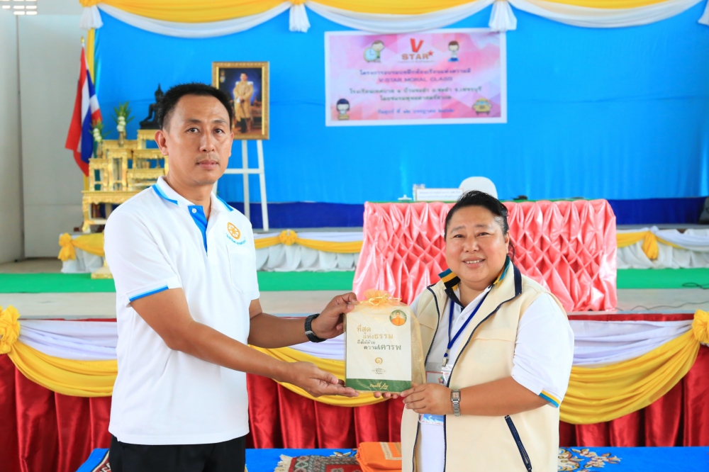 คุณประอรรัตน์ ข่าวดี ผู้ประสานโครงการฟื้นฟูศีลธรรมโลก V-STAR ภาคตะวันตก มอบของที่ระลึกให้ ท่าน ณัฐรี เนียมเงิน รองผู้อำนวยการโรงเรียนเทศบาล 1 บ้านชะอำ และ อาจารย์ มงกุฎ ตรีเงินกุล คุณครูผู้ประสานงานโครงการฟื้นฟูศีลธรรมโลก v-star