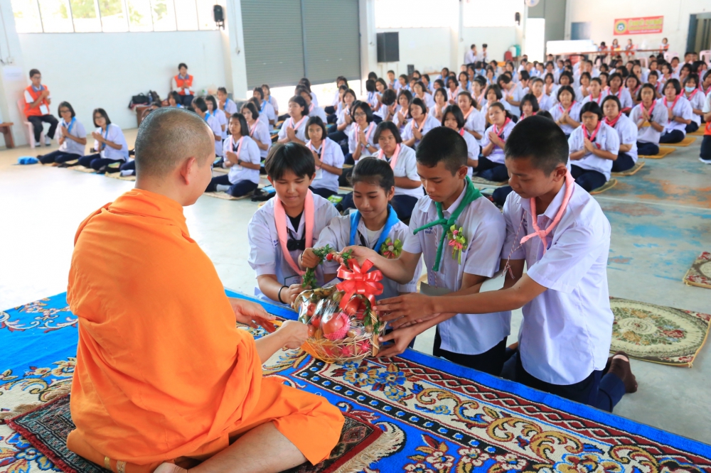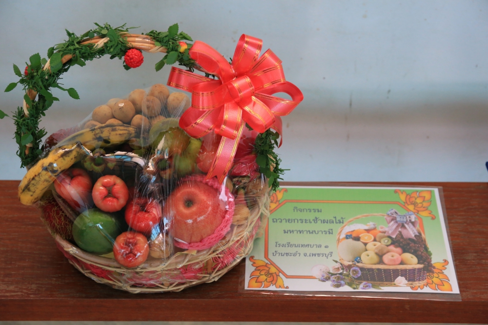 กิจกรรมถวายกระเช้าผลไม้ ตัวแทนนักเรียนชายและหญิง กล่าวคำถวายทั้งภาษาบาลี