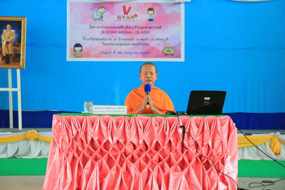 ในวันที่ 12 กรกฎาคม 2562 ระหว่างเวลา 08.30-15.30 น. ณ อาคารอเนกประสค์ โรงเรียนเทศบาล 1 บ้านชะอำ อ.ชะอำ จ.เพชรบุรี เริ่มด้วยพิธีเปิดกิจกรรม โดยประธานในพิธีคือ ท่าน ณัฐรี เนียมเงิน รองผู้อำนวยการโรงเรียนเทศบาล 1 บ้านชะอำ ประธานเปิดโครงการ นำจุดธูปเทียนบูชาพระรัตนตรัย สวดมนต์ และ อาจารย์ มงกุฎ ตรีเงินกุล คุณครูผู้ประสานงานโครงการฟื้นฟูศีลธรรมโลก v-star เป็นผู้กล่าวรายงาน ซึ่งงานนี้ได้รับความเมตตาจาก พระอาจารย์อำนาจ อติวโส พระอาจารย์จากชมรมพุทธศาสตร์สากล มาแสดงธรรมเรื่องบทฝึกห้องเรียนแห่งความดี ให้น้องๆ ฟัง และนำสวดธัมมจักกัปปวัตตนสูตรก่อนแบ่งกลุ่มเข้าฐานกิจกรรม