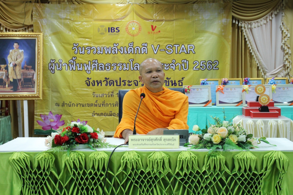 ด้วยโครงการฟื้นฟูศีลธรรมโลก ร่วมกับศูนย์ส่งเสริมศีลธรรมประจำจังหวัด และหน่วยงานภาครัฐ“วันรวมพลังเด็กดี V-Star ผู้นำฟื้นฟูศีลธรรมโลก ประจำปีพุทธศักราช 2562” จังหวัดประจวบคีรีขันธ์ ขึ้นในวันเสาร์ที่ 14 ธันวาคม 2562 ณ สำนักงานเขตพื้นที่การศึกษาประถมศึกษาประจวบคีรีขันธ์ เขต 1 ห้องประชุมตะนาวศรี จ.ประจวบคีรีขันธ์ โดยมีคณะครูและนักเรียนร่วมงานกว่า 300 คน โดยมีวัตถุประสงค์เพื่อรวมพลังสร้างความดี และเจริญสมาธิภาวนาถวายเป็นพุทธบูชา ต่อยอดกิจกรรมการเรียนรู้ในโครงการ และปลูกฝังจิตสานึกในการเป็นดาวแห่งความดีผู้นำฟื้นฟูศีลธรรมโลก (เด็กดี V-Star) ให้ยิ่งๆ ขึ้นไป ตลอดจนเพื่อส่งเสริมการเรียนรู้พระพุทธศาสนาและกฎแห่งกรรมผ่านการรับชมภาพยนตร์ Animation “พุทธประวัติ” และการร่วมกิจกรรมฐาน Activity Base Learning “ห้องเรียนแห่งความดี” “บทฝึกกิจวัตรเด็กดี V-Star” และ “ธัมมจักกัปปวัตตนสูตร” อีกทั้งนักเรียนจะได้ร่วมการ ทดสอบความรู้พื้นฐานบทฝึกเด็กดี V-Star เพื่อเป็นการประมวลความรู้กิจกรรมในวันงาน และการฝึกฝนอบรมตนเองอีกด้วย