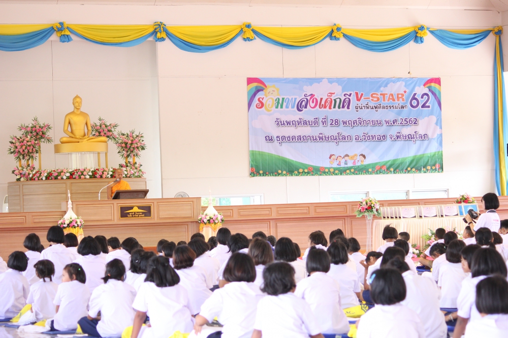 วันพฤหัสบดี ที่ 28 พฤศจิกายน ที่ผ่านมาชมรมพุทธศาสตร์สากล ในอุปถัมภ์สมเด็จพระมหารัชมังคลาจารย์ร่วมกับธุดงคสถานพิษณุโลก จัดกิจกรรมวันรวมพลังเด็กดี V-Star ผู้นำฟื้นฟูศีลธรรมโลก จังหวัดพิษณุโลก ประจำปี 2562 ณ ธุดงคสถานพิษณุโลก อำเภอวังทอง จังหวัดพิษณุโลก ในครั้งนี้เด็กดี V-Star ได้เรียนรู้เกี่ยวกับพระพุทธศาสนาและกฎแห่งกรรมผ่านการรับชมภาพยนตร์ Animation “พุทธประวัติ” และร่วมกิจกรรมฐาน Activity Base Learning “ห้องเรียนแห่งความดี” “บทฝึกกิจวัตรเด็กดี V-Star” และ “ธัมมจักกัปปวัตตนสูตร” กิจกรรมในครั้งนี้ทำให้นักเรียนได้ทบทวนกิจวัตรและบทฝึกของเด็กดี V-Star ซึ่งถือว่าเป็นพื้นฐานที่จะสามารถนำไปต่อยอดและพัฒนาศักยภาพเยาวชนให้เป็นคนเก่งและดีของประเทศชาติสืบต่อไป