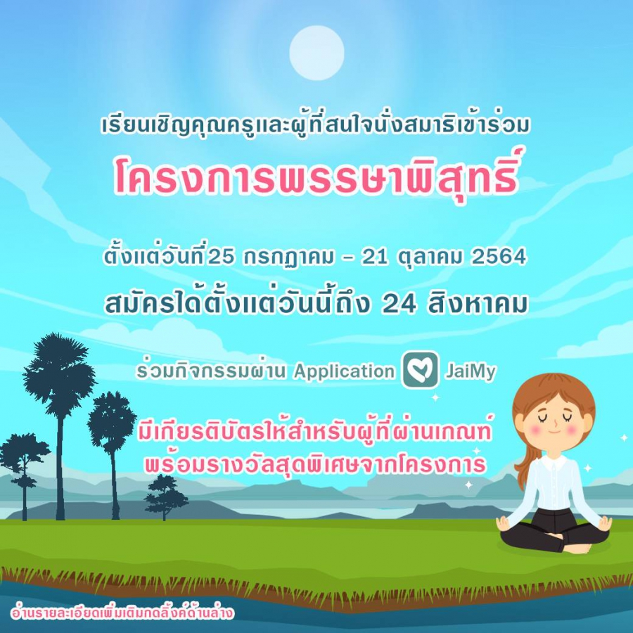 25 กรกฎาคม 2564 ถึงวันที่ 21 ตุลาคม 2564 ผ่านทางแอพพลิเคชั่น JaiMy เปิดตั้งแต่คุณครูหรือบุคคลทั่วไปที่รักการปฏิบัติธรรม เพื่อให้ส่งเสริมให้ผู้เข้าร่วมโครงการมีความสุขจากภายใน