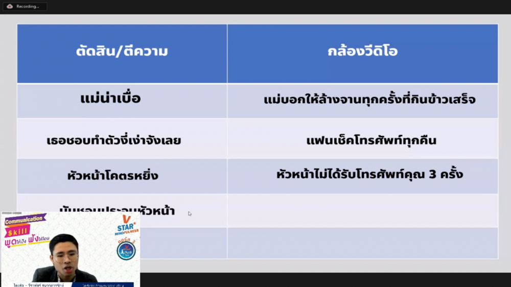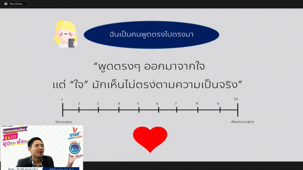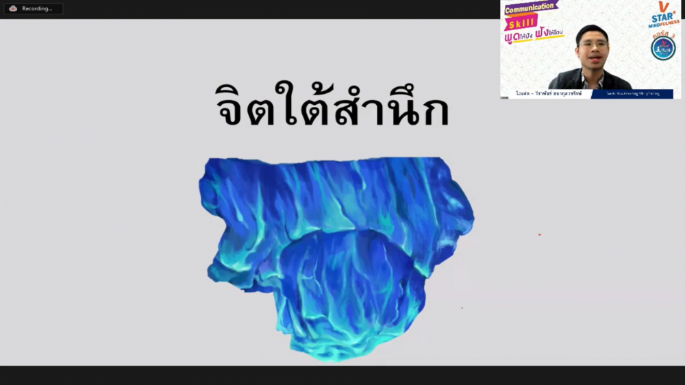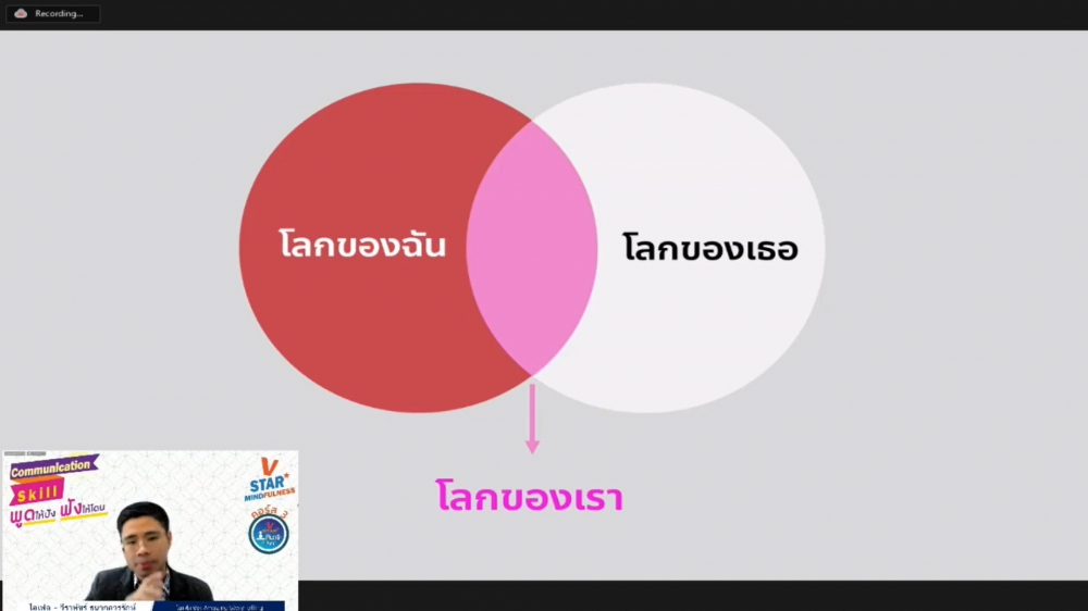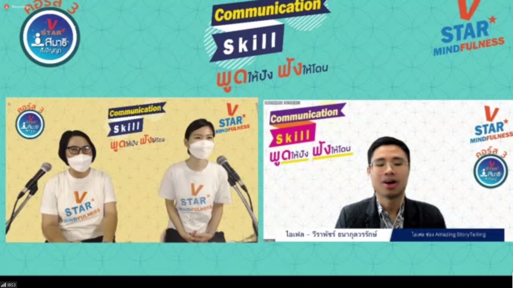 ชมรมพุทธศาสตร์สากล ในอุปถัมภ์สมเด็จพระมหารัชมังคลาจารย์ จัดคอร์สอบรมพัฒนาศักยภาพโครงการ V-Star สมาธิต้นปัญญา (V-Star Mindfulness) คอร์สที่ 3 “Communication Skill พูดให้ปัง ฟังให้โดน” โดยคุณไอเฟล วีราพัชร์ ธนากุลวรรักษ์ เจ้าของช่อง Youtube : Amazing StoryTelling เมื่อวันอาทิตย์ที่ 15 สิงหาคม พ.ศ.2564 เวลา 14.00-16.00 น. ให้กับคณะครูและนักเรียน ผ่านทางแอพลิเคชั่น Zoom ออนไลน์ การอบรมคอร์สนี้ฝึกให้ผู้เข้าร่วมอบรมสื่อสารได้อย่างชัดเจน ตรงกับความเป็นจริง มีความเห็นอกเห็นใจ และไม่ตัดสินตีความ